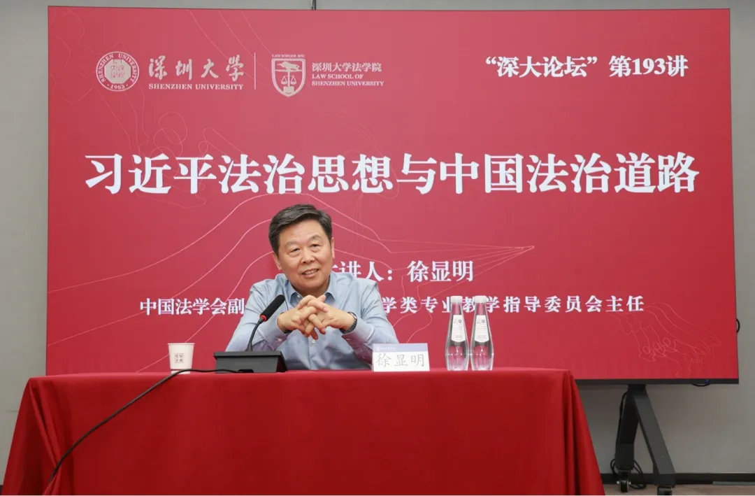 On the afternoon of April 1, 2024, Professor Xu Xianming, Vice President of the China Law Society, visited the Law School of Shenzhen University (SZU) and served as a guest speaker at the 193rd session of the "Shenzhen University Forum." His lecture was titled "Xi Jinping's Thought on the Rule of Law and the Path of China's Legal System." This forum was co-hosted by the Social Sciences Department and the SZU Law School. The event was attended by over 100 faculty members and students, including SZU Vice President Wang Yongcheng, Social Sciences Department Director Zeng Xianju, Shenzhen Talent Group Chairman Gao Dawei, and members of the Law School. The lecture was chaired by Dean Xiong Wei.