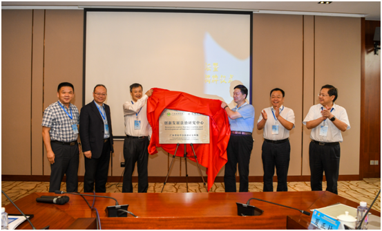 之后,由最高院所第一巡回法庭郭修江副庭长、广东省法学会姜滨副会长、中国政法大学时建中副校长、广东财经大学杜承铭副校长、深圳大学徐晨副校长、中国人民大学法学院王轶院长共同上台为“创新发展法治研究中心”揭牌。