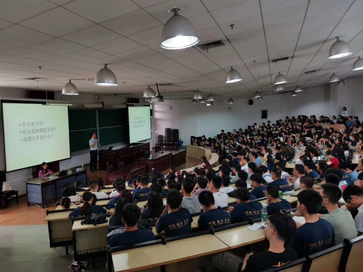 黄老师从“什么是大学”、“什么是深圳的大学”和“深圳大学是什么”三个方面给新生上了大学第一课。黄老师耐心地解读了大学学习与高中学习的区别,明确大学学习是从“要我学”到“我要学”的转化,是探究式、成长式的学习。并指出,真正的大学学习的身体负担不比中学轻,但是心理负担要更少。因为投入自己所喜欢的事,“累并快乐着”。