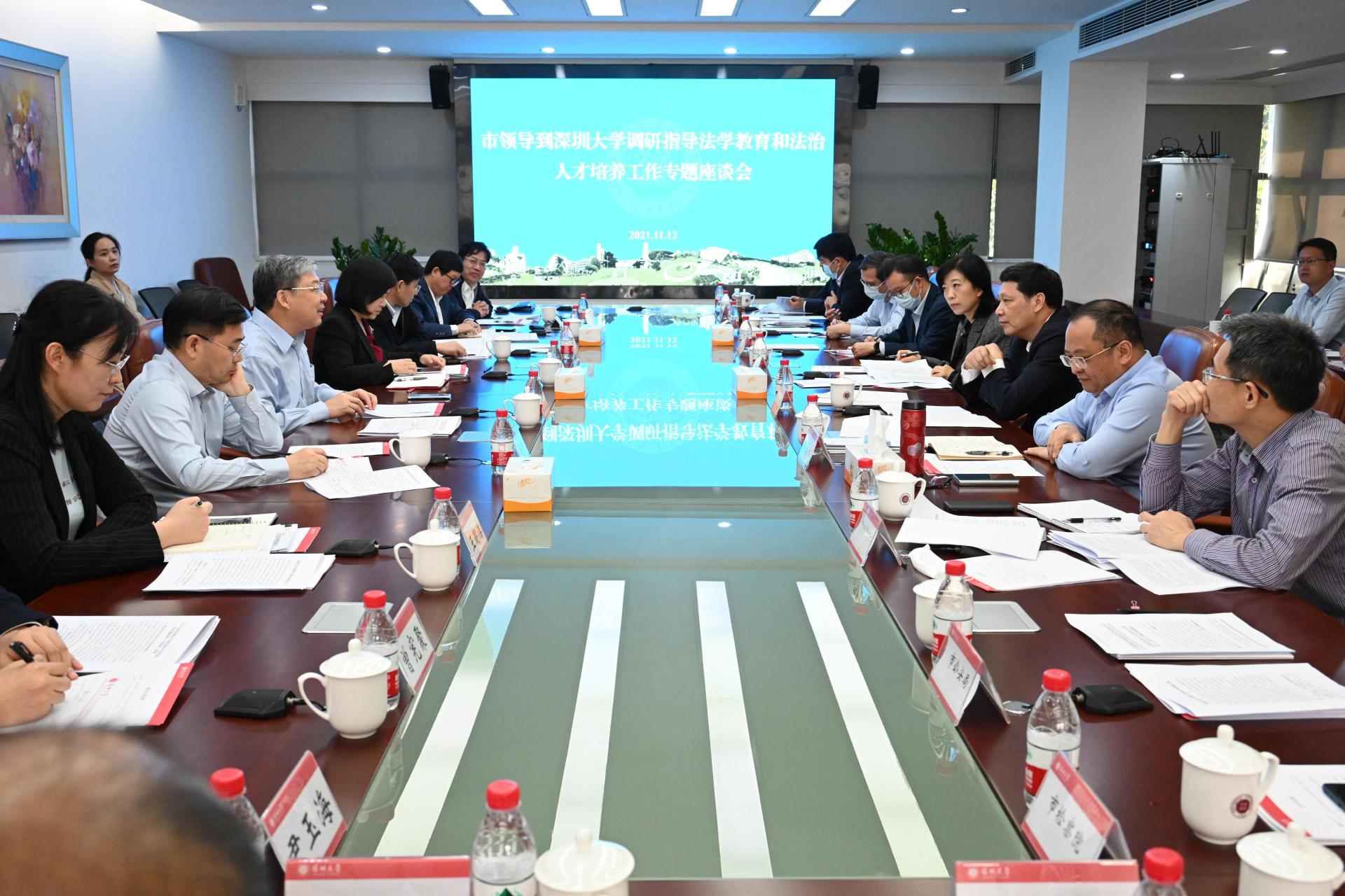 11月12日下午,深圳市委依法治市办组织相关部门到我校调研法学教育、法治人才培养工作,并召开座谈会。会议围绕如何推进深圳大学建设高水平法学院,共同谋划深圳法治人才培养工作进行了深入研讨。深圳市委常委、政法委书记、市委依法治市办主任余新国主持会议。深圳市委依法治市办副主任、市司法局局长蒋溪林,深圳市委政法委副书记汪洪等有关领导,我校党委书记、校长李清泉出席会议。我校法学院负责人和法学相关专业教师代表参加会议。
