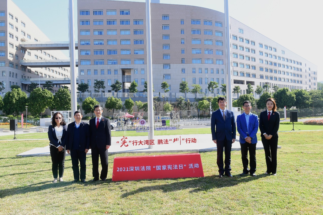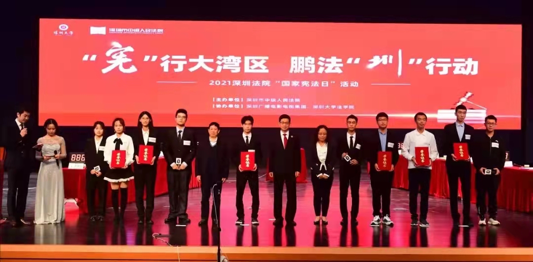 为深入学习宣传习近平法治思想,贯彻落实十九届六中全会精神,12月2日,深圳市中级人民法院主办,各区人民法院参与,由深圳大学法学院和深圳市广电集团协办,在深圳大学丽湖校区组织开展“宪行大湾区,鹏法圳行动”活动,宣传“国家宪法日”,进一步弘扬宪法精神,增强宪法意识。深圳市中级人民法院党组成员、副院长黄志坚、深圳大学副校长李永华、法学院党委书记李卫英、院长刘俊、丽湖管委办主任阮彬,市人大代表方成群、韦小冰、胡春华,深圳法院部分法官和法官助理以及深大法学院师生代表共180人参加活动。