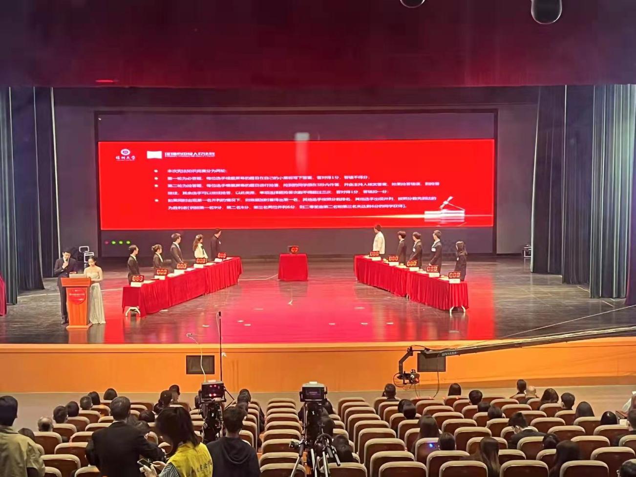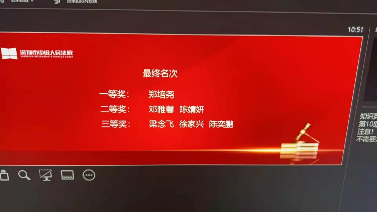 在深圳大学学生积极热情的参与之下,经过一轮的初赛,筛选出十位优秀的选手参加到决赛当中。宪法知识竞赛的决赛总共分为必答题和抢答题两轮,其中单项选择题、填空题和不定项选择题随机分布,整个比赛过程紧张刺激,而又不失智慧的体现。每一位选手也都在比赛当中展现出深大学子的风采,不怕失败,敢于尝试,在抢答场冷静应对,谨慎面对每一道题目,同时也不放过每一个机会。前海法院林培俊法官、福田法院李磊法官、罗湖法院栾媛法官、盐田法院田晓燕法官到场,结合宪法条文,对竞赛题目进行点评和讲解。
