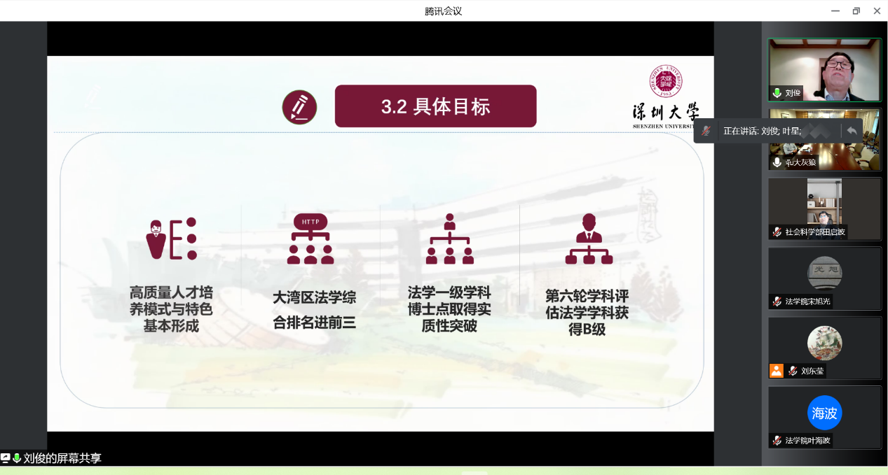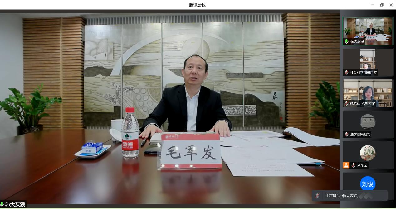 2022年3月28日,深圳大学校长毛军发院士、副校长张晓红教授召开线上调研会议,详细了解法学院发展历程,调研指导法学院高水平法学院建设等相关情况,教务部主任袁磊、研究生院执行院长明仲、社会科学部主任田启波、人力资源部副主任高颖(主持工作)、党政办公室(非学历教育管理办公室主任)郑志平等同志陪同调研。法学院院长刘俊、党委书记李卫英、党委副书记叶星、副院长侯玲玲、副院长叶海波、副院长宋旭光、院长助理段礼乐等人参加了调研会。
