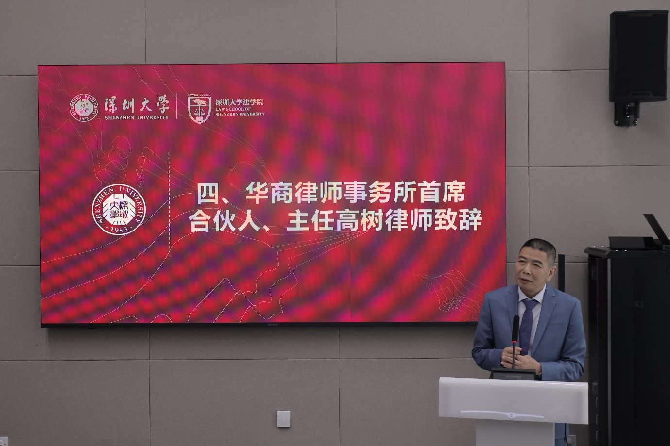 华商律师事务所首席合伙人高树主任致辞。在致辞中引用了雨果在《巴黎圣母院》开篇中的名句“我们肩负重任,我们昂首前瞻。”并以此勉励华商精英班的同学们,“当你们选择的时候,就已经决定了所肩负的使命。”华商律师事务所校外实践导师将就研究兴趣、专业导向等与同学们保持密切的沟通与交流,希望各位同学经过华商精英班纵深式、高级别、创新性的培养,在学习法律技能的同时,也能学到法律人身上的担当和法治的精髓。未来不仅能够成为深圳大学法学院和华商律所的骄傲,也能够成为整个法律界的骄傲。高树主任用自己的诗句祝贺华商精英班正式开班:“因为海阔天空,所以别开生面”。