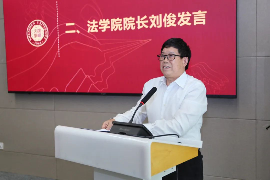 接着,法学院院长刘俊汇报了华商精英班的创办历程与开办理念。刘俊院长指出,华商精英班历经一年多的筹备,以高考录取成绩优异度为基础,通过“双盲”结构化面试,精心挑选出40名同学进入华商精英班学习,他对这40名同学表示最衷心地祝贺。刘俊院长指出,设立华商精英班的总体目标定位,是致力于打造中国20年后的法界精英,同时探索法治人才教育培养规律,推动法治人才模式与方式创新,塑造深圳法律人才培养特色品牌。为实现华商精英班设立的目标,我们将从三方面全面推动法治人才培养创新:一是构建人才培养共同体,推动法学教育机构与多元主体之间联合培养机制的形成,与华商律师事务所、西南政法大学实行联合人才培养;二是制定科学合理的人才培养方案,大幅度提高课程的有效性,构建起学生合理的专业知识体系,并与华商律师事务所一起开发一批卓有成效的法律职业技能训练课程,研究制定法律职业技能训练标准,探索并建立法律职业技能训练体系;三是全面推动以激发学生主体意识和学习兴趣为核心的翻转课堂、即兴体验式互动课堂、情景课堂、讨论课、案例课等教学方法改革。刘俊院长对华商精英班全体同学提出了三点要求和希望:做好考研的准备,刻苦勤奋努力地学习,以及寻找适合自己的有效学习方法。