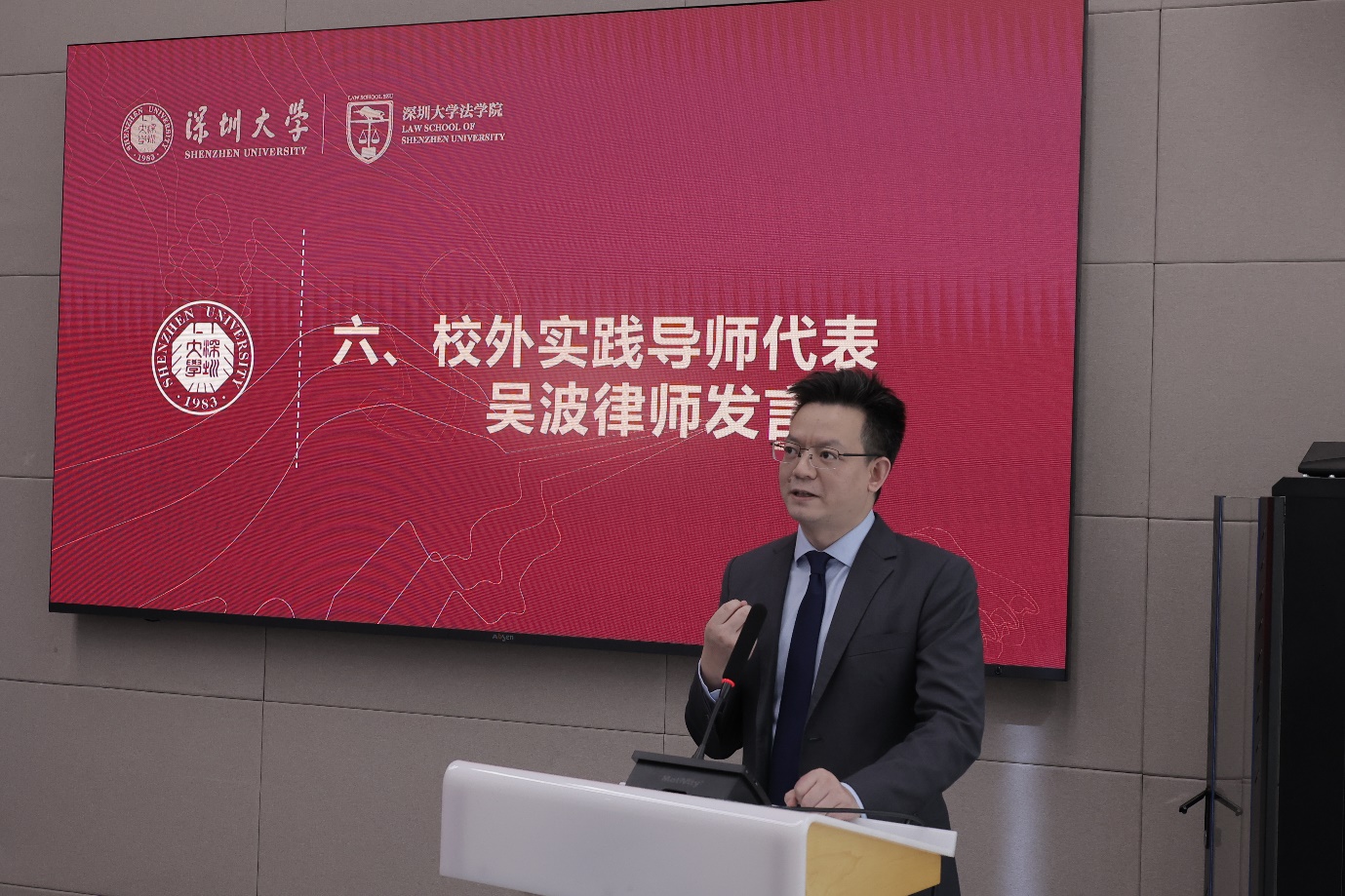 校外实践导师代表、华商执行合伙人吴波律师对华商班的协同育人理念进行了交流。他表示,他本人便是华商内生式人才培养与传帮带理念的受益者,他讲述了华商精英班内生式、专业化、国际化、终身学习等协同育人理念。目前,华商已在全球范围内已设立40多家分支机构,形成了全产业链服务,已设立22个专业委、6个研究院、5个业务中心,实现专业法律服务全覆盖,具备将入学新生逐渐培养为法界精英的基础与能力。吴波律师对深大法学院致力于法学教育改革的决心和情怀表示钦佩,感谢深大给予华商深入参与这一伟大事业的机会,并向全体华商精英班同学表达了祝贺与期许。