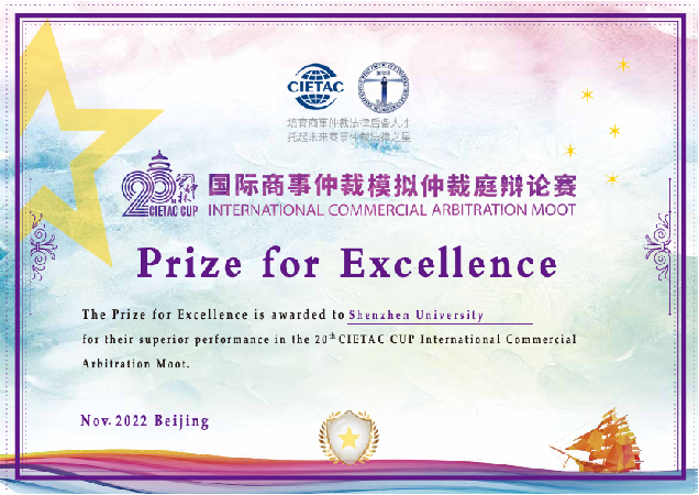 2022年12月2日,第二十届“贸仲杯”获奖名单公布。深圳大学代表队凭借着在循环赛中优异的表现,最终与东南大学、上海交通大学、厦门大学等法学强校并列,成功斩获本届“贸仲杯”优胜奖。这是深圳大学代表队建队以来获得该赛事的最佳成绩。