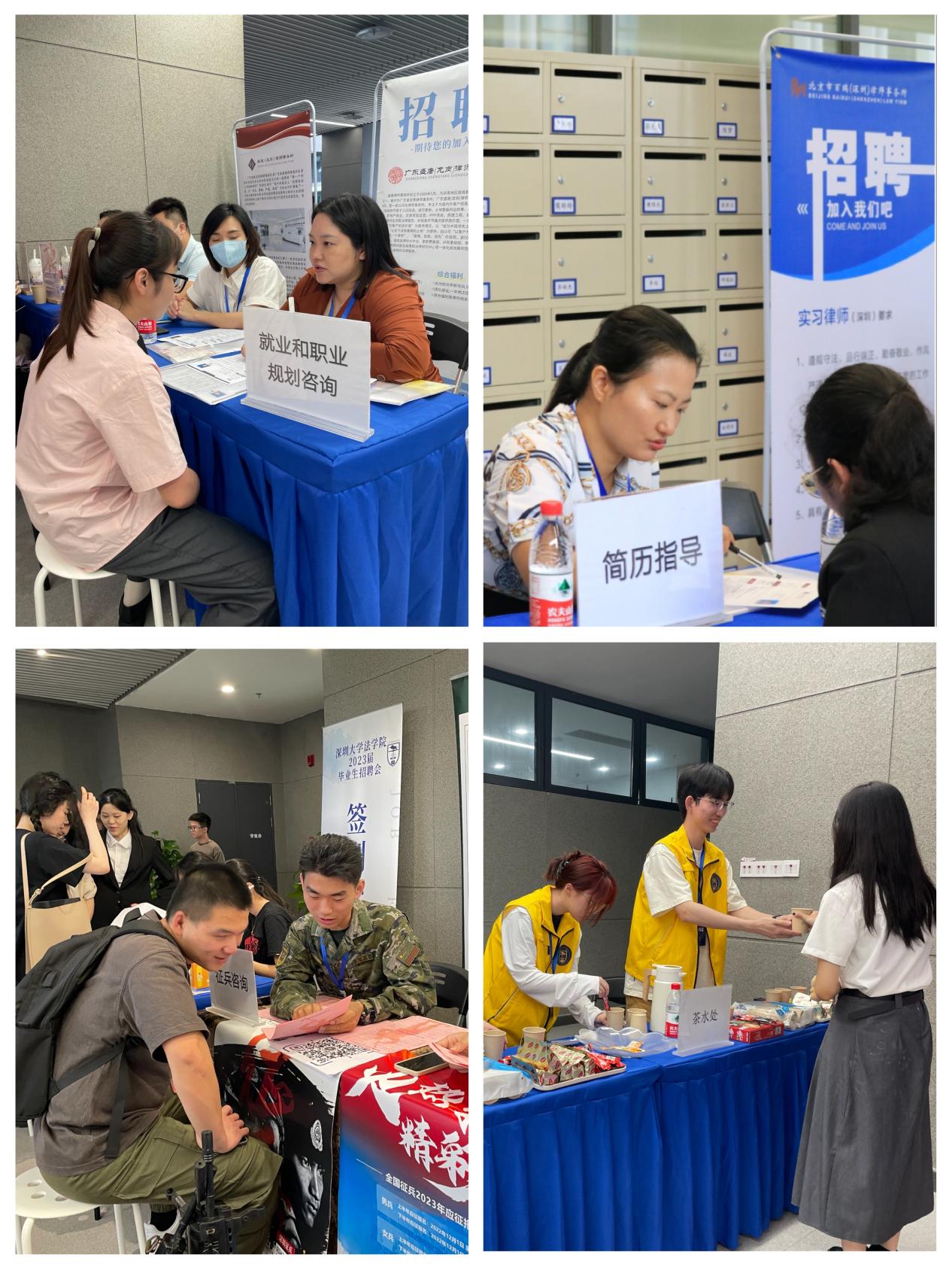 本次招聘会设有就业和职业规划咨询、简历指导和征兵宣传等特色专区。各个专区人头涌动,同学们积极咨询,与老师一对一沟通,为职业生涯规划进一步做准备。恰逢雷雨天气,我院还为与会人员贴心提供了姜糖水、花茶和咖啡等,为招聘会现场注入一股暖意。