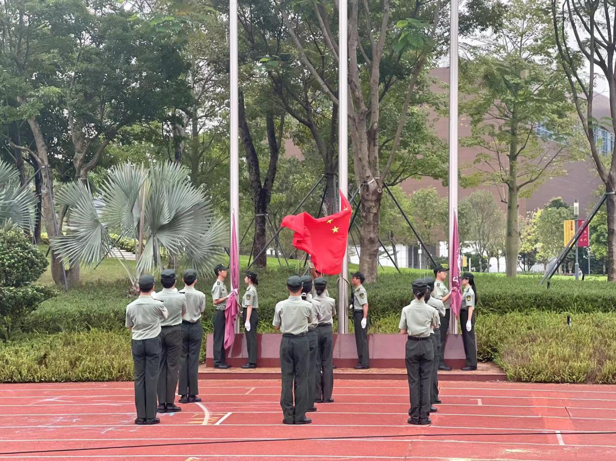 同学主持仪式。伴随着高昂的歌声,国旗护卫队步伐整齐,姿态昂扬地将五星红旗护送进场。嘹亮的号声响起,国旗冉冉上升,全体师生庄严肃立,高唱国歌,行注目礼。随后升校旗,奏《歌唱祖国》。