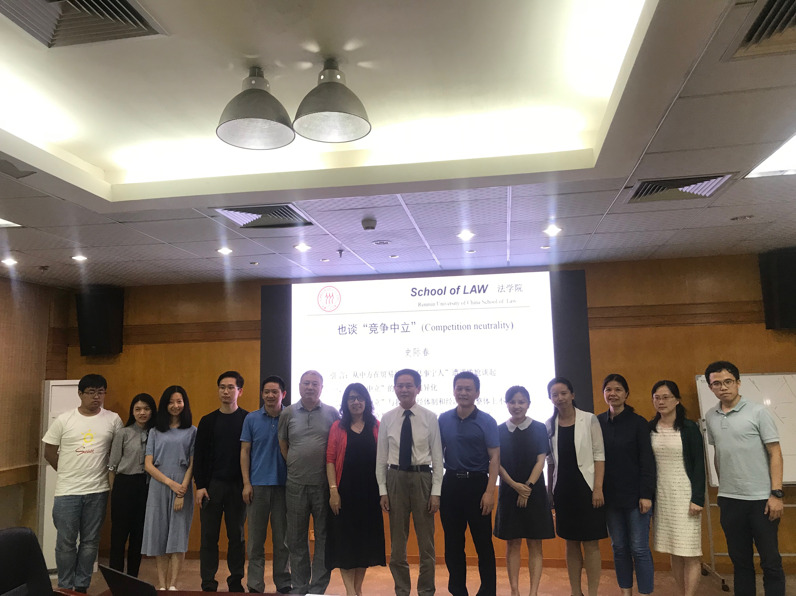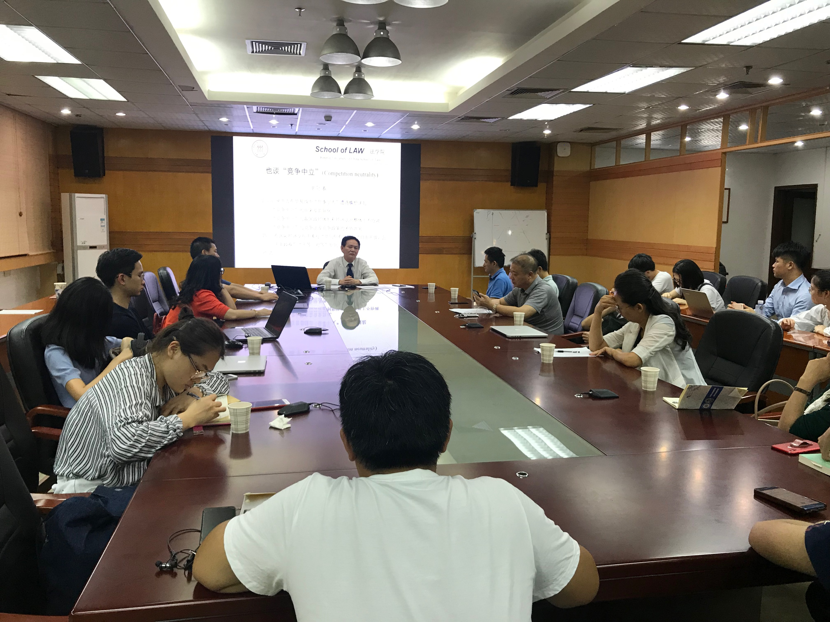 史教授首先从当下的时事热点“中美贸易战”切入,简要地讲述了当下中方在中美贸易战中的处境,然后自然地将其话题引申至“竞争中立”的由来与异化。史教授认为,美国对中国非“竞争中立”的指责,实质上是在“妖魔化”中国国有企业。紧接着,史教授就“竞争中立”与我国经济体制和经济法治整体上不协调、“竞争中立”与竞争法及竞争政策的矛盾冲突、在国际经济交往中奉行“共同但有区别”“自由开放、公平非歧视”“平等、对等”原则这几部分内容展开了具体讲述。史教授的讲解高屋建瓴,深入浅出,引人深思。最后,史教授与师生们进行了交流,不仅同学们提问踊跃,老师们亦是各抒己见,各位老师结合各自研究领域探讨了对“竞争中立”的理解并提出了问题,史教授逐一回应。