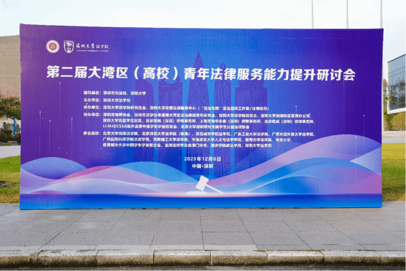 On December 6, 2025, the Second Greater Bay Area (University) Youth Legal Service Capacity Enhancement Seminar was successfully held at Shenzhen University. The seminar was guided by the Justice Bureau of Shenzhen Municipality and Shenzhen University, hosted by the School of Law of Shenzhen University, and organized by the Graduate Student Union of the School of Law and the Volunteer Legal Service Center of Shenzhen University ("Legal Pioneer" Legal Publicity Studio/Legal Clinic).