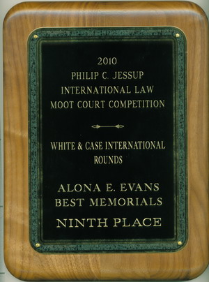 第五十一届 Jessup全球总决赛于3月20日至27日在美国首都,华盛顿特区的希尔顿大酒店举行。本次比赛,深圳大学法学院代表队创造了中国大陆地区法学院的历史最好成绩,不仅代表中国首次进入全球前24强的复赛,也是唯一初赛总分超过3000分的中国大陆代表队,还获得了诉状全球第九名的佳绩,被授予由国际著名法学教授EVANS先生命名的ALONA E.EVANS 最佳诉状奖,这也是中国大陆的代表队第一次获得由主办方颁发的奖项。