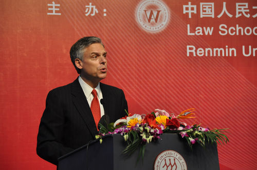 随后德国驻华大使施明贤、加拿大驻华大使马大维、巴基斯坦驻华大使马苏德•汗和美国驻华大使洪博培依次致辞。施明贤大使从国际法在国际关系中的重要作用出发阐述了他对于国际法乃至法律的理解,马大维大使则以幽默风趣的语言向学生们推荐起加拿大的法律教育,并代表加拿大欢迎同学们赴加留学。洪博培大使不仅幽默风趣,汉语还十分地道,最后精辟的阐述了中美关系为“互相帮助,互相学习”。