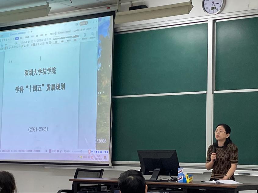 接下来,法学院副院长侯玲玲同志发言。她在发言中对法学院学科“十四五”发展规划做了简单的介绍,并表示要处理好法学院定位与发展的关系,必须把发展目标具体化,科学研究与人才培养两手抓,确保人才质量稳步提升。同时,她提出深圳的双区建设对于法学院学科发展提出更高要求,法学院要实现“信息+”与法律学科融合发展,推动学科交叉发展,寻求学科发展的突破与转型,建设深大特色的“法学+N”体系与具有显著影响力的学科队伍。