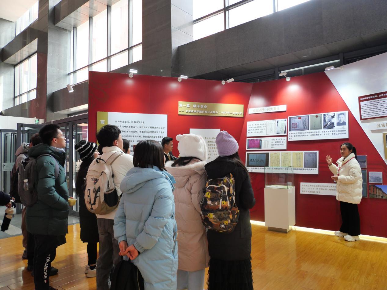 实践教学团在法大志愿者同学的讲解下了解法大65周年建校史以及习近平总书记对法大做出的重要指示。