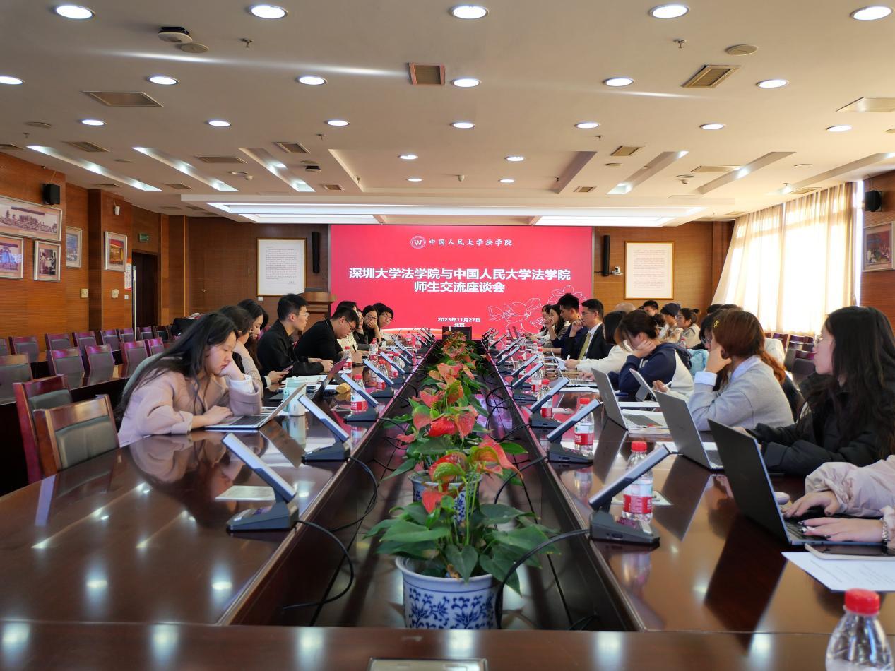 会议伊始,双方简单介绍了两校参会人员,并且回顾了人大法学院高铭暄教授援建深大法学院的深厚情谊。随后进入交流活动环节,活动分为“教师交流”以及“学生交流”两个部分。“教师交流”部分,双方就法学院学生实习、实践、就业创新经验,学生工作品牌化项目经验,加强校企合作,教务教学育人模式等内容进行交流。“学生交流”部分,两校法学院的学生干部简单介绍了法学院学生组织和社团架构、竞赛及特色活动的情况。