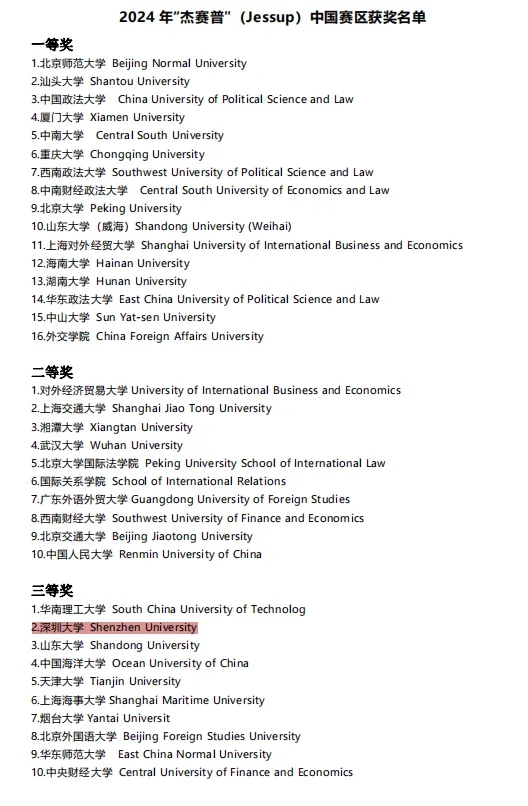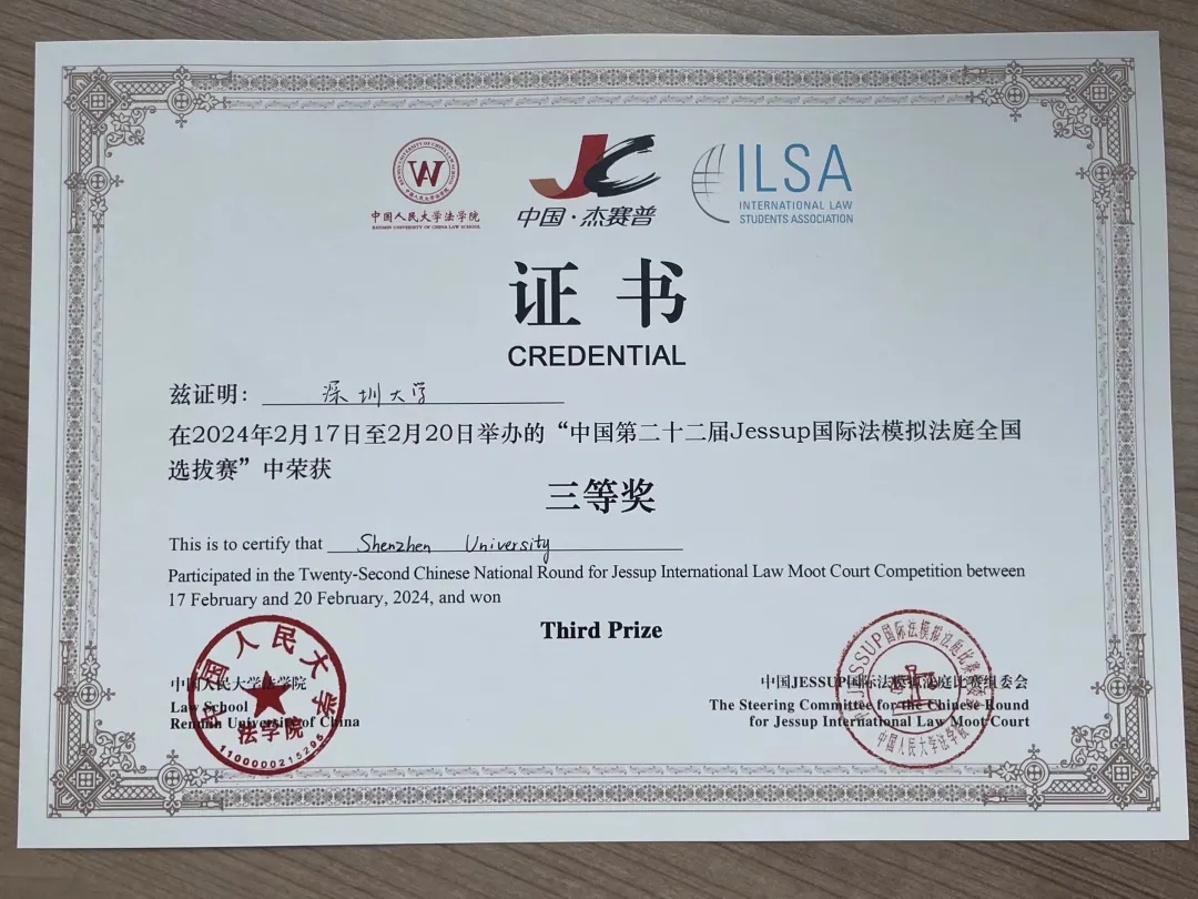 2024年2月17日至19日,中国第二十二届Jessup国际法模拟法庭全国选拔赛(Philip C. Jessup International Law Moot Court Competition)在北京市中国人民大学明德法学楼举行。本次竞赛共有北京大学、清华大学、中国人民大学、中国政法大学等65所高校参与。深圳大学代表队在与北京师范大学等晋级全球赛的实力强队角逐后,荣获“全国三等奖”。