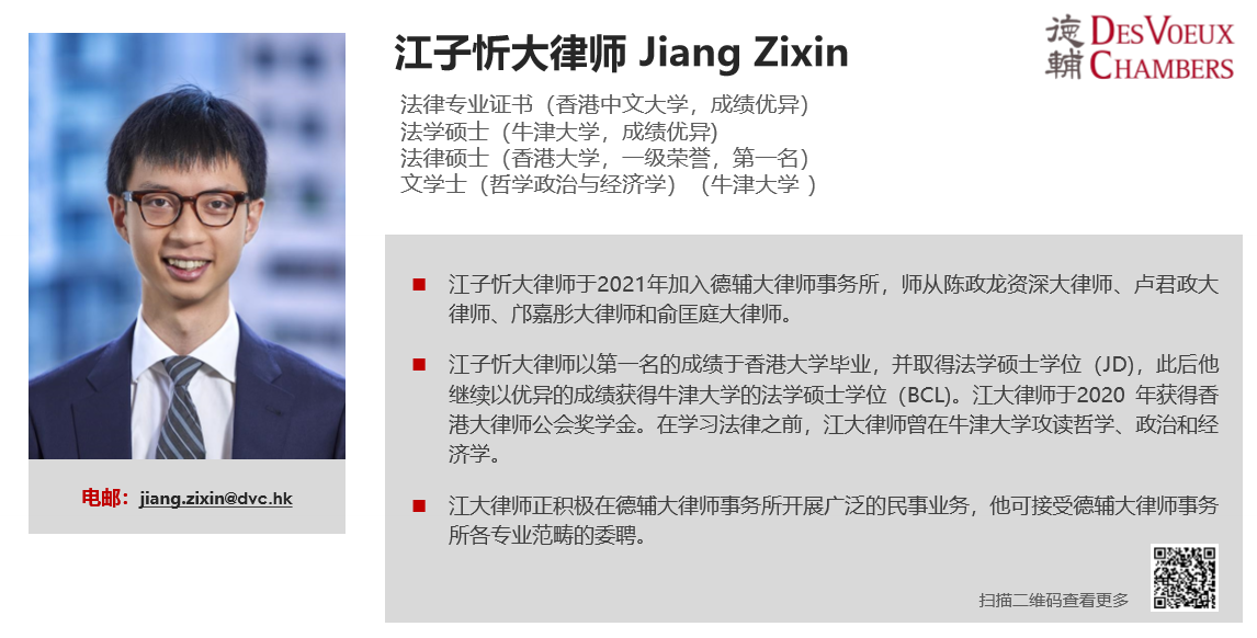 江子忻大律师于2021年加入德辅大律师事务所,以第一名的成绩于香港大学毕业,并取得法学硕士学位(JD),此后他继续以优异的成绩获得牛津大学的法学硕士学位(BCL),他正积极在德辅大律师事务所开展广泛的民事业务。