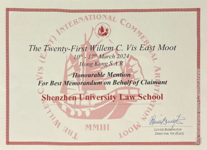 2024年3月10日至17日,第二十一届Willem C. Vis East国际商事仲裁模拟仲裁庭竞赛(“Vis East”)在香港举行。在本届赛事中,深圳大学代表队在来自全球33个国家和地区共144支代表队中脱颖而出,荣获申请方最佳书状提名(Honourable Mention For Best Memorandum on Behalf of Claimant)和被申请方最佳书状提名(Honourable Mention For Best Memorandum on Behalf of Respondent)。深圳大学代表队是中国(含港澳台)参赛队伍中唯一荣获最佳书状双提名的队伍!