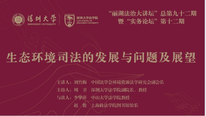 2024年6月14日,深圳大学丽湖法治大讲坛暨“实务论坛”第十二期主题为“生态环境司法的发展与问题及展望”的讲座在法学院开讲。本次讲座由中国法学会环境资源法学研究会刘竹梅副会长主讲,中山大学法学院李挚萍教授和上海政法学院图书馆馆长赵俊教授参加与谈。