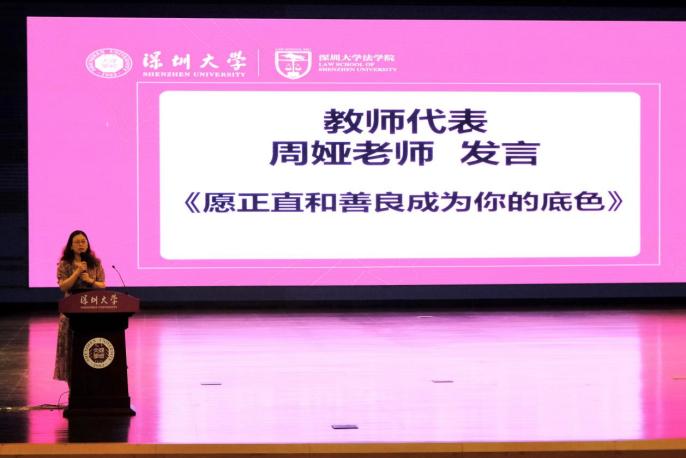 周娅老师代表教师首先发言。她以诙谐轻松的方式,结合生活实际为尚未接触法学专业课程的大一新生引入了“法律”这一概念,希望同学们能拥有正直、善良的法律人底色;引用游戏《黑神话·悟空》CEO的话:“踏上取经路,比抵达灵山更重要”,指出体验远比结果更重要,以此鼓励各位同学未来积极参与学院的各类赛事、实习工作等活动,从而丰富法学学习体验;并真挚地祝愿各位同学能在深圳大学法学院习得知识,收获热爱。
