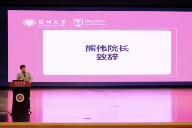 熊伟院长发表致辞,代表全体教职员工热烈欢迎新同学的到来;对2024级本科生、研究生的录取情况,深圳大学和深圳大学法学院的基本情况做了简要概述;重点提及了基于优越的区位优势和学科需要,深大法学院在涉外法治工作和知识产权法与科技法方面取得了创新突破、法学专业首次获得A类评级(排名提升至全国前15%)和新增法学一级博士点。