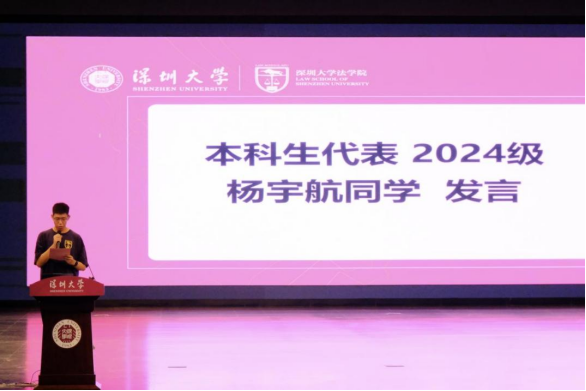 2024级本科新生代表杨宇航发言。他分享了与深圳大学结缘的故事并提出了对大学生活的思考:应当勇担责任,砥砺前行;勤学不辍,勇攀高峰,还对自己及各位同学未来的法学学习生涯表达了美好的祝愿,希望“沿着前人未尽的道路,走出更遥远的距离。”