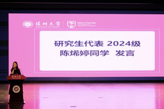 2024级研究生新生代表陈烯婷发言。她回顾了过去四年在法学院感受过的热烈与震撼,并展望即将开始的研究生生涯,指出敢闯敢试不止是深圳精神,也当是迎接挑战、化解困难的坚定信念;奥运圣火不止在巴黎点燃,也当化作追求进步、奋勇拼搏的精神象征,指引大家勇攀高峰、实现人生价值,认为“我们的研究生生涯将是一场与自我、与世界、与知识的深度对话。”