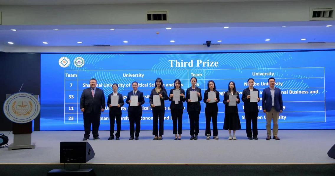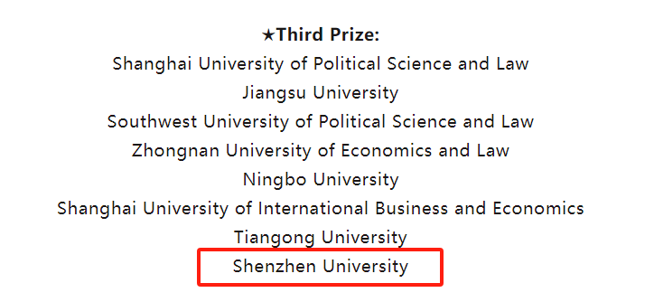 我校师生首次参赛,以饱满的热情和严谨的态度投入比赛。经书状打分环节,我校与中国政法大学、华东政法大学、西南政法大学、中南财经政法大学、西北政法大学、中国海洋大学等16所高校共同晋级庭辩环节。经过两天的激烈角逐,深圳大学代表队荣获全国三等奖。