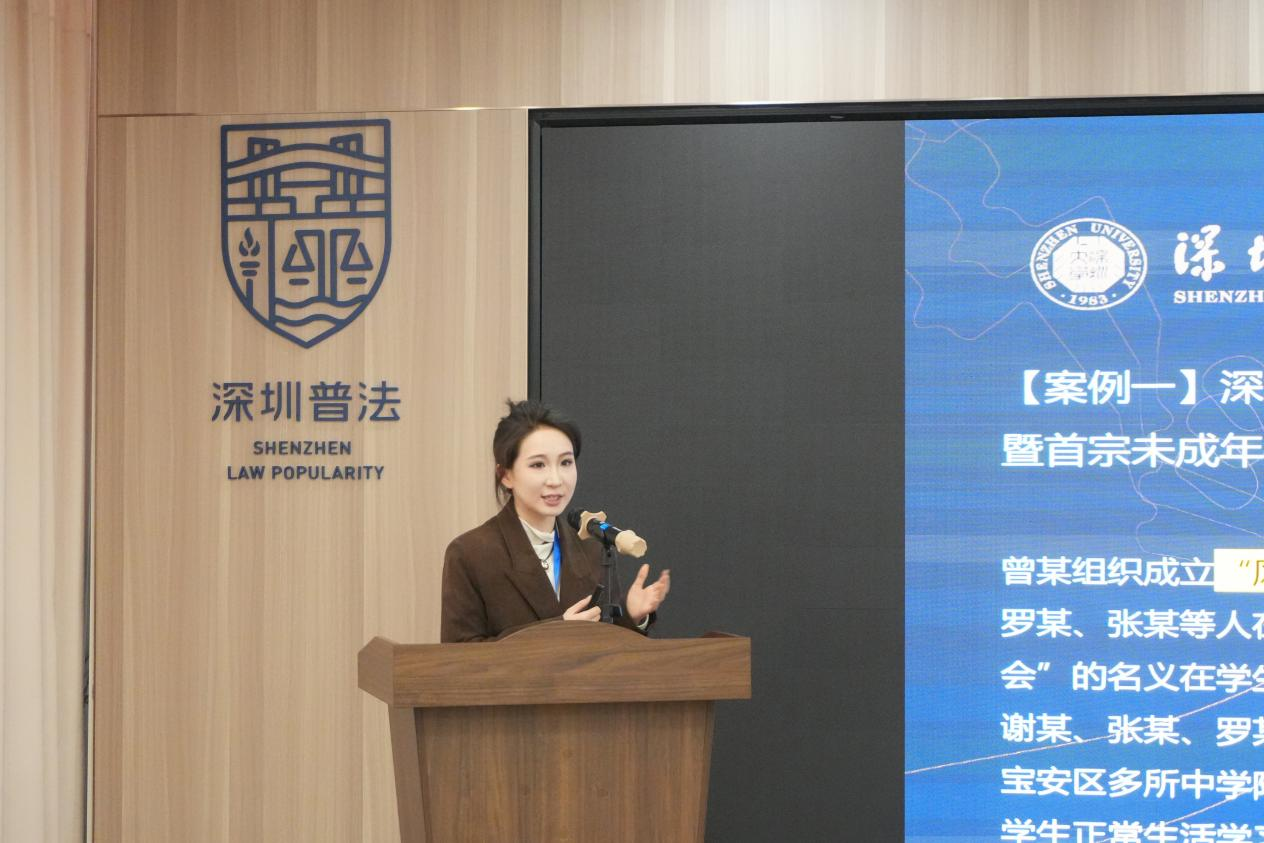 活动第二阶段,由深圳大学“法治先锋”普法宣讲工作室成员杨茂茂作为普法宣传工作室成员发言,并开展以未成年人保护为主体的普法宣讲活动。宣讲开始,主讲人杨茂茂以“规”和“矩”为切入点,引出“做人要遵纪守法”的道理,以及对“法”的理解。并介绍未成年人受到的六大保护,分别从“家庭保护”“学校保护”“社会保护”“网络保护”“政府保护”“司法保护”六大方面联系《未成年人保护法》相关法条规定,通过丰富的现实案例,为大家介绍未成年保护的重要性,并呼吁大家重视未成年人保护。