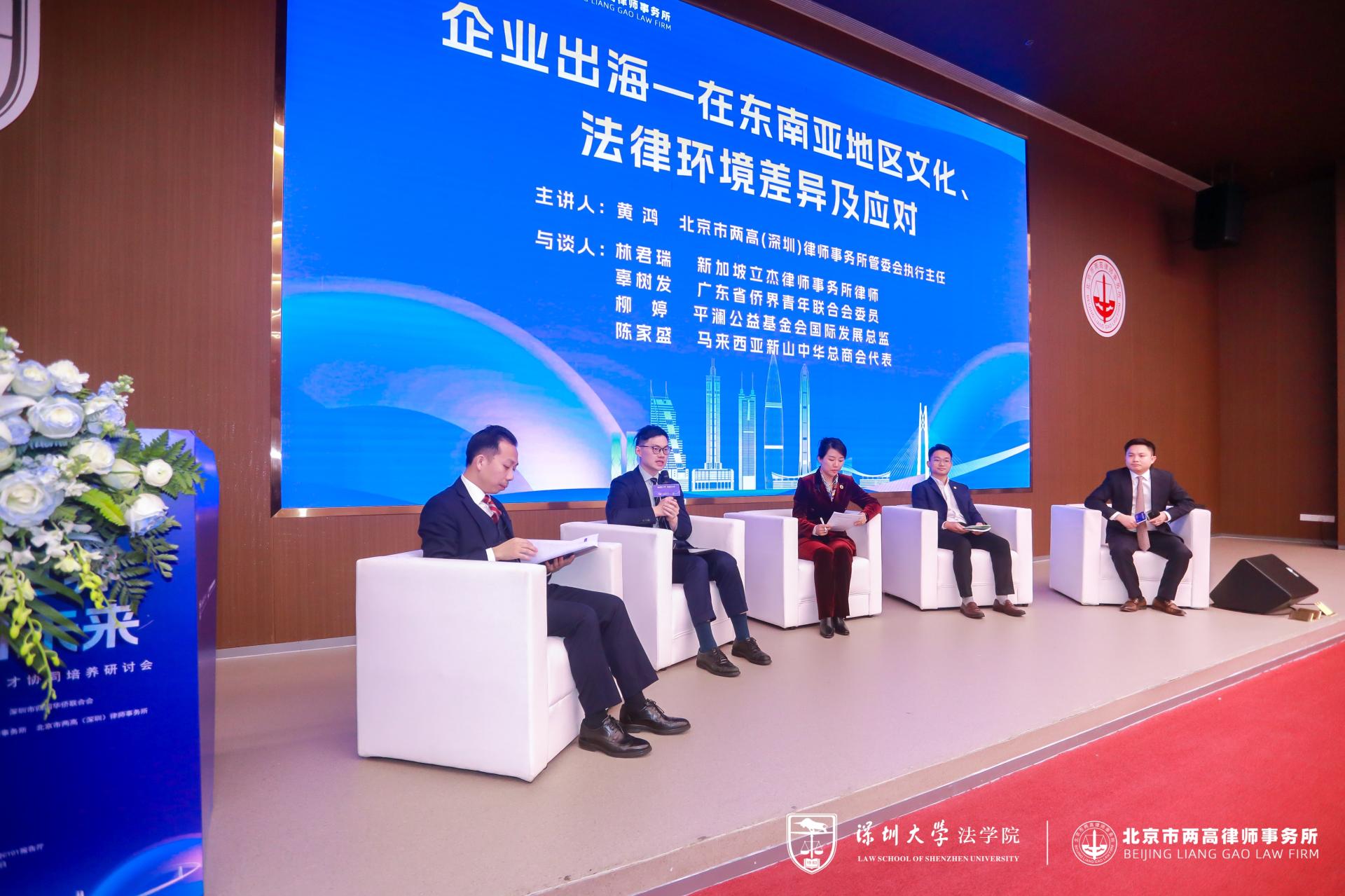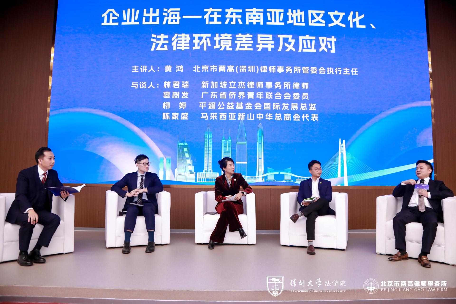 北京市两高(深圳)律师事务所管委会执行主任黄鸿律师主持“企业出海—在东南亚地区文化、法律环境差异及应对”主题圆桌论坛,新加坡立杰律师事务所林君瑞律师、广东省侨界青年联合会委员辜树发、平澜公益基金会国际发展总监柳婷、马来西亚新山中华总商会代表陈家盛围绕主题,结合东南亚工作生活经验,各抒己见、热烈讨论。