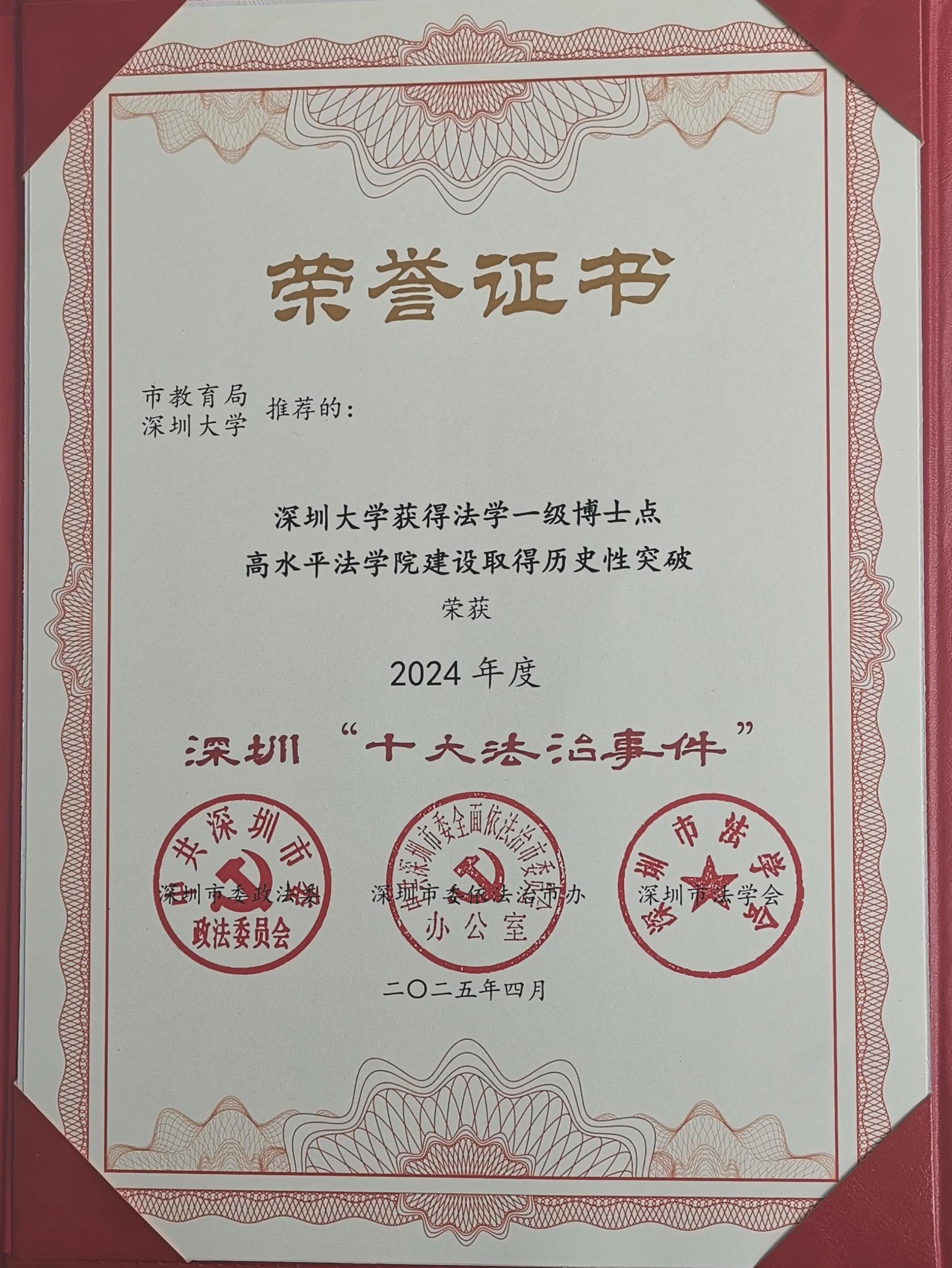 由深圳市教育局和深圳大学法学院申报的“深圳大学获得法学一级博士点 高水平法学院建设取得历史性突破”入选深圳“十大法治事件”。