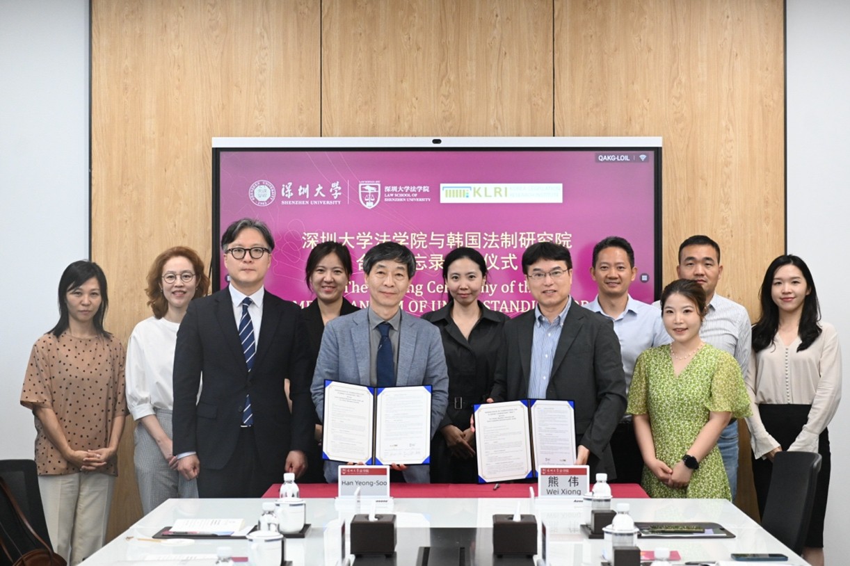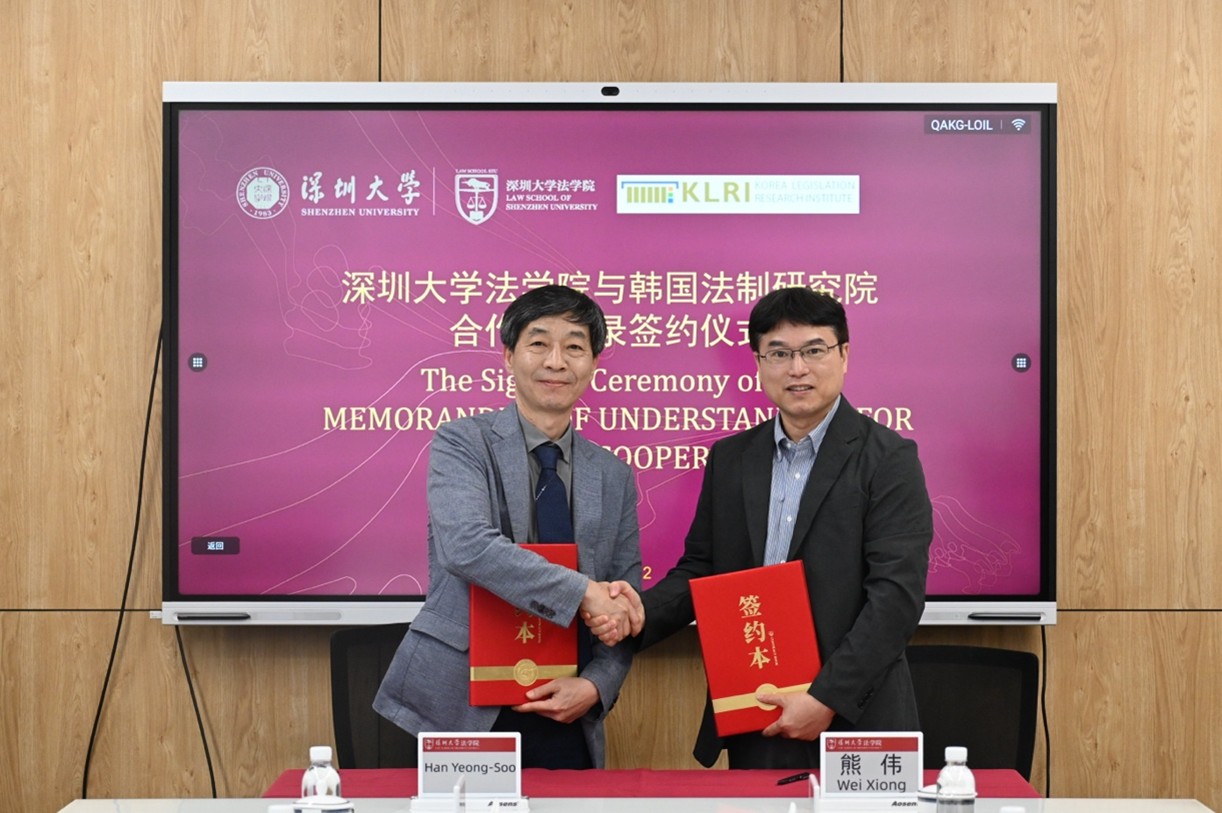 2025年5月22日下午,深圳大学法学院与韩国法制研究院合作备忘录签约仪式暨座谈会在深圳大学丽湖校区明律楼417会议室隆重举行。出席本次活动的嘉宾有韩国法制研究院院长Han Yeong- Soo,韩国法制研究院立法创新、规制改革及财政立法团队负责人Park Se-Hun,成员Ra Kee-Won、Hwang Ee-Kyung,北京大学经济学院中国信用研究中心副研究员Min Young-Mi。本次活动由深圳大学法学院院长熊伟,副院长叶海波,副院长陈梦,副教授段礼乐,宣传外事秘书尹露出席。
