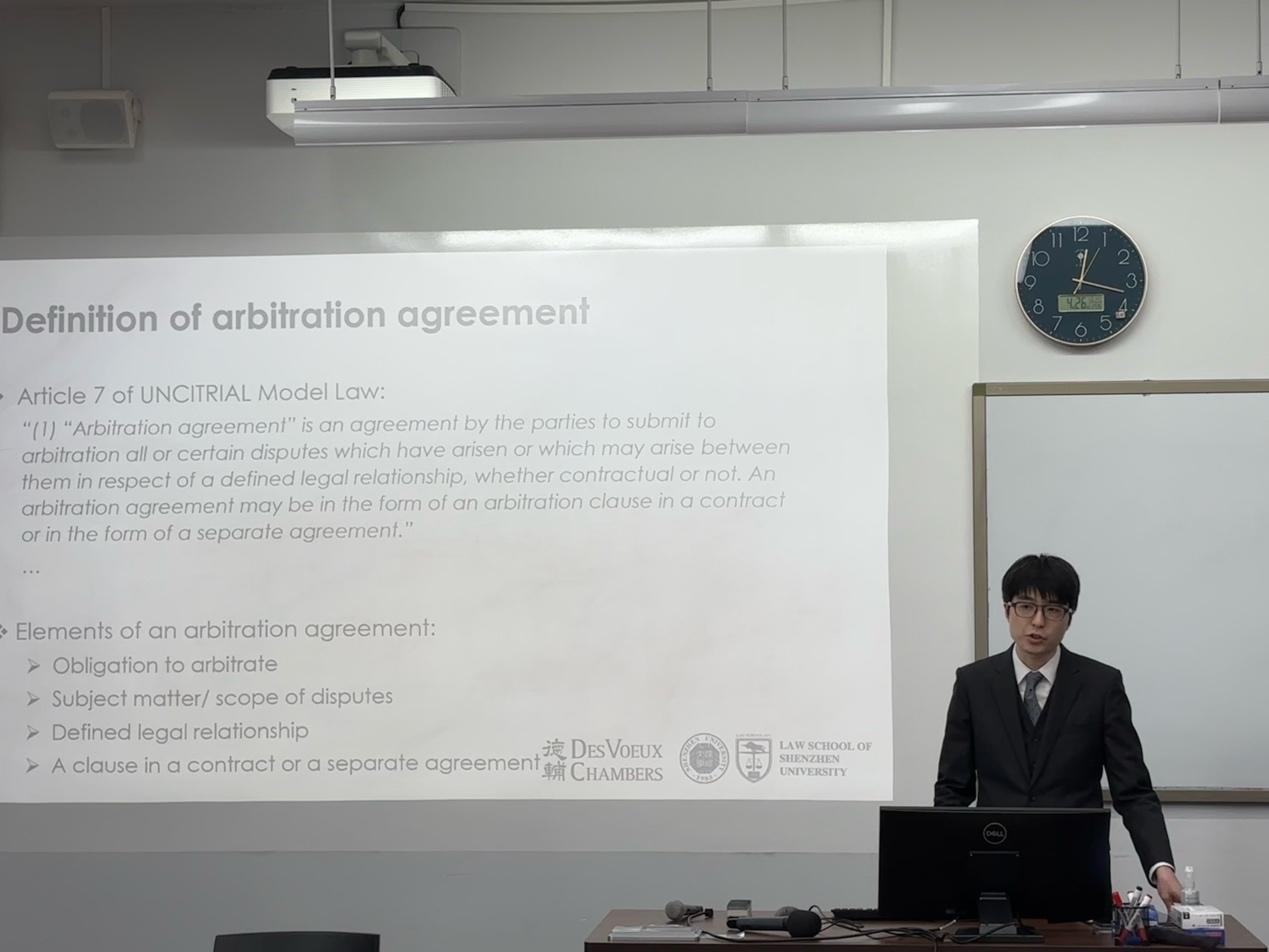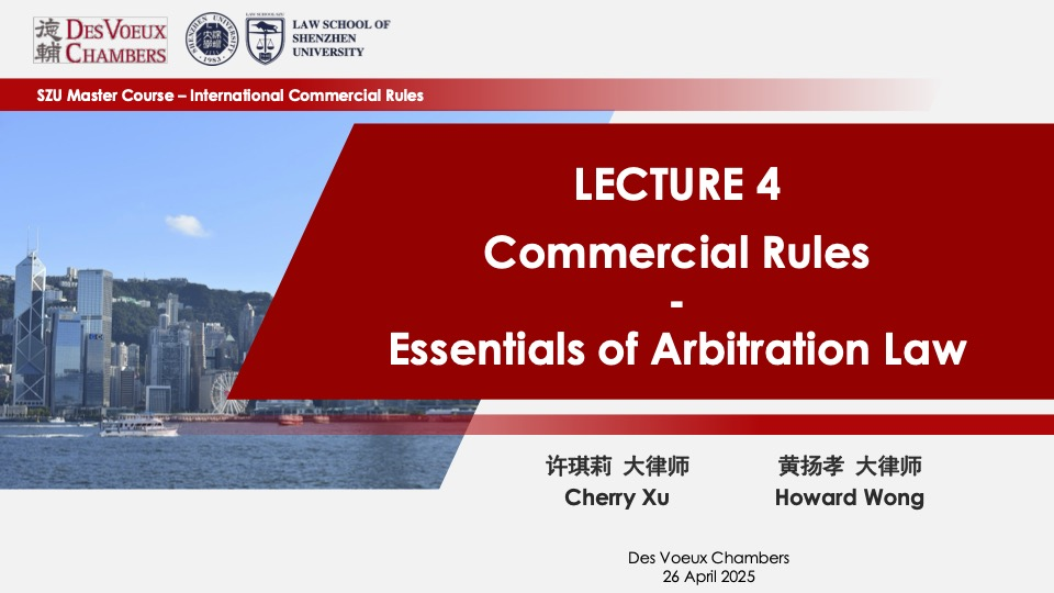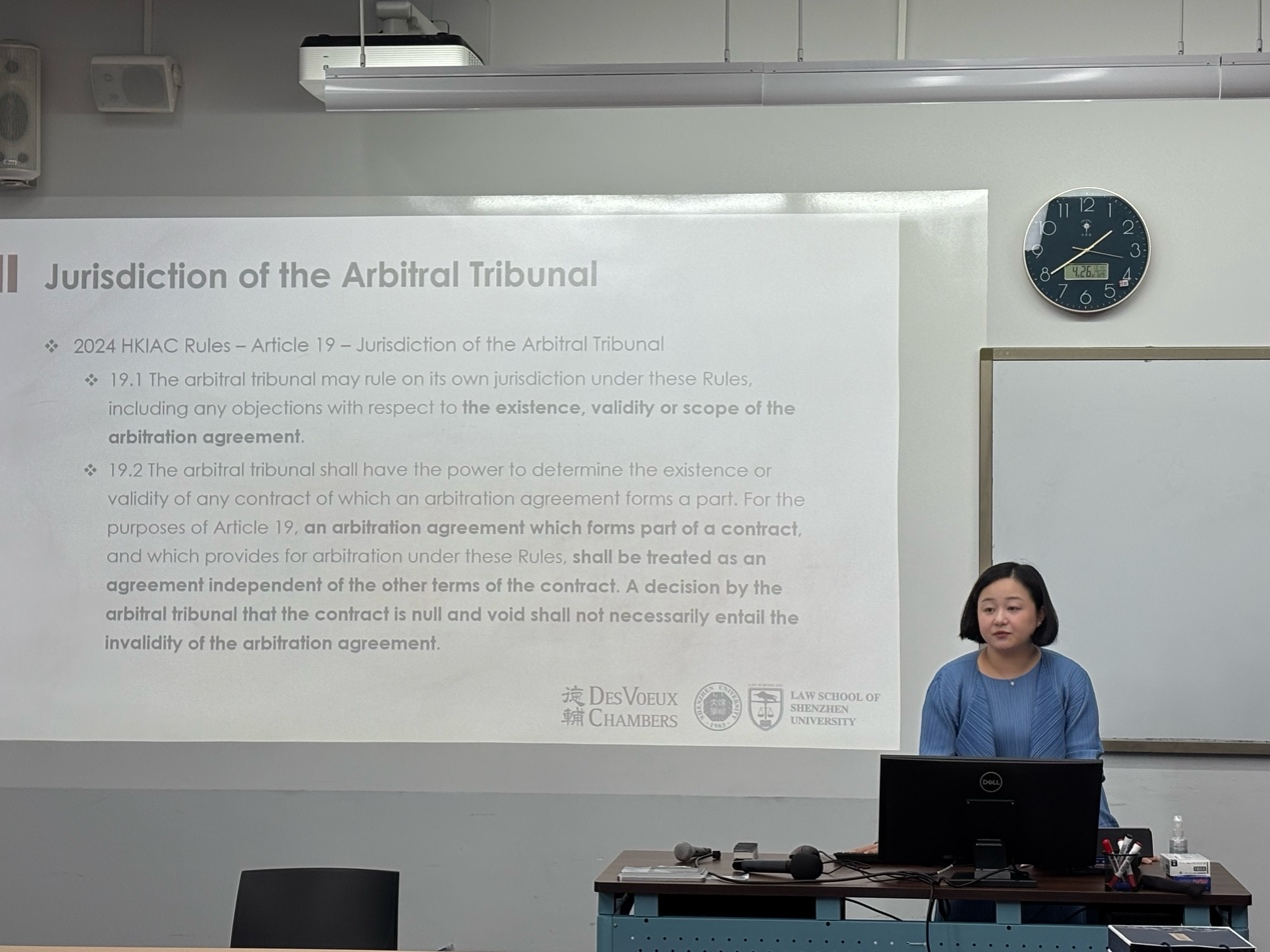 2025年4月26日,香港德辅大律师事务所的许琪莉大律师(Cherry Xu)和黄扬孝大律师(Howard Wong)共同为深大法学院国际仲裁法律硕士带来了“德辅法学课程”之“仲裁法精要”(Essentials of Arbitration Law)。本次课程聚焦国际商事仲裁的关键环节,系统解析仲裁协议、仲裁程序、证据听证及裁决执行等核心议题,结合香港及国际经典案例,为同学们呈现了一堂理论与实践并重的仲裁法实务课。