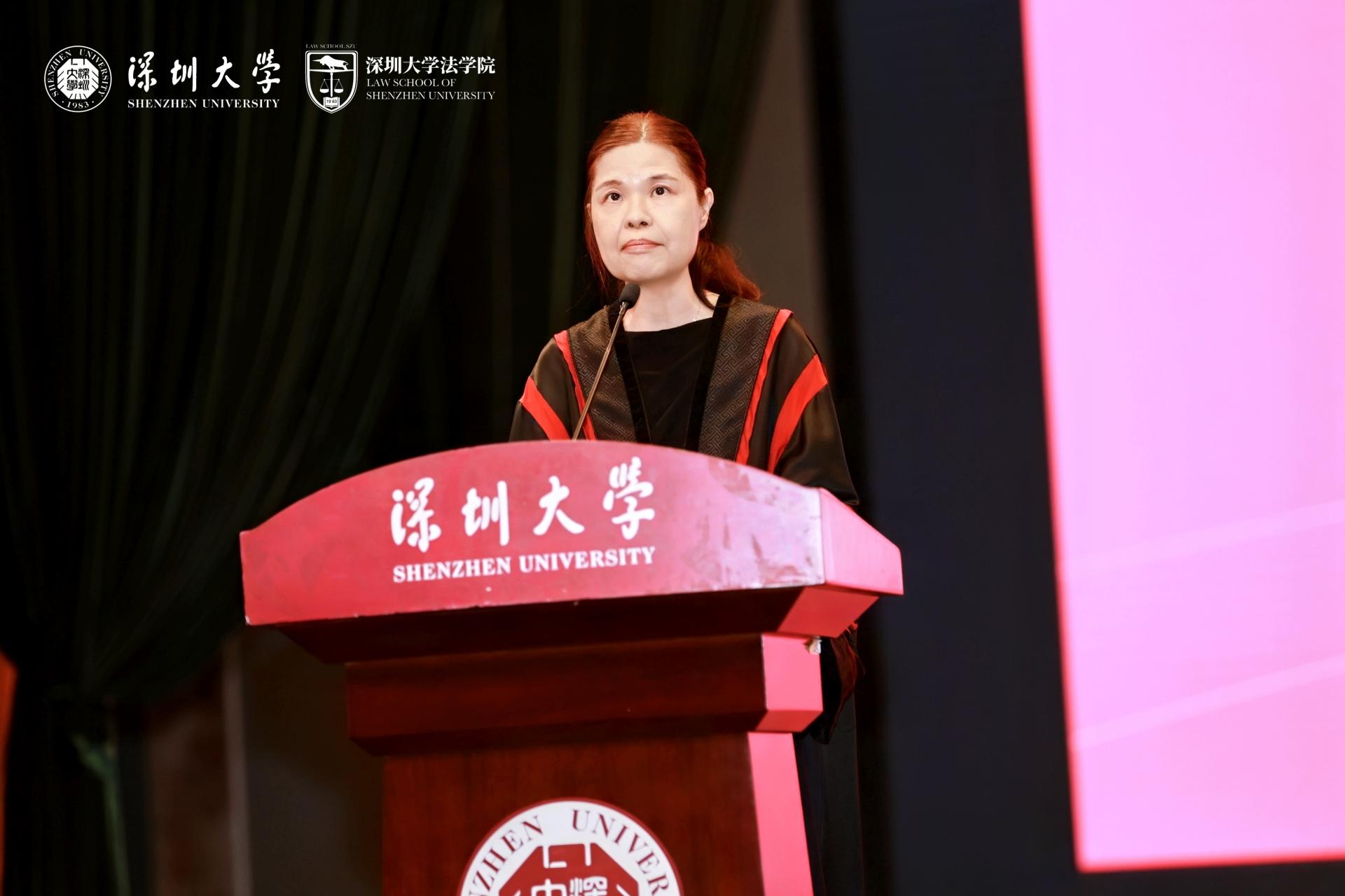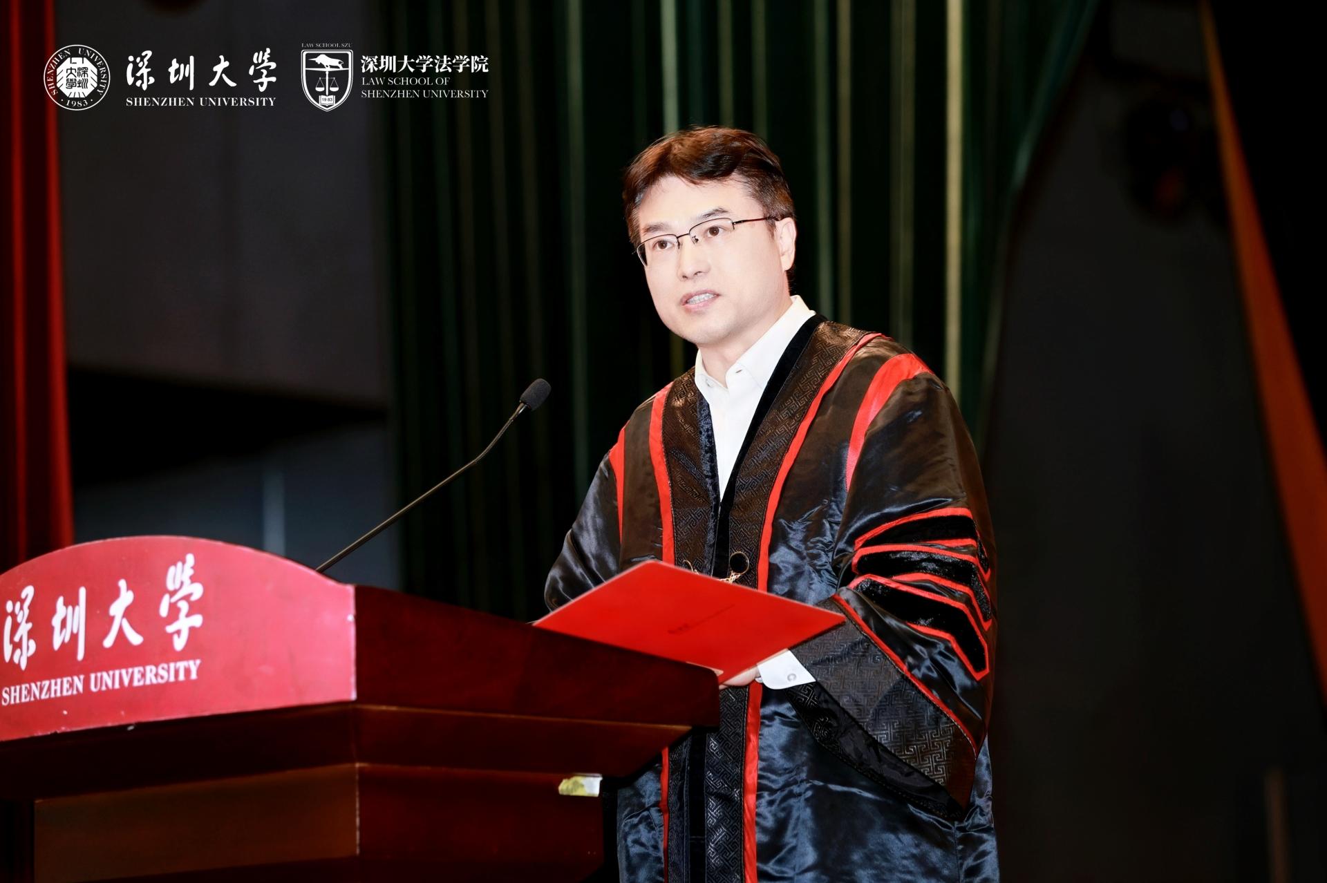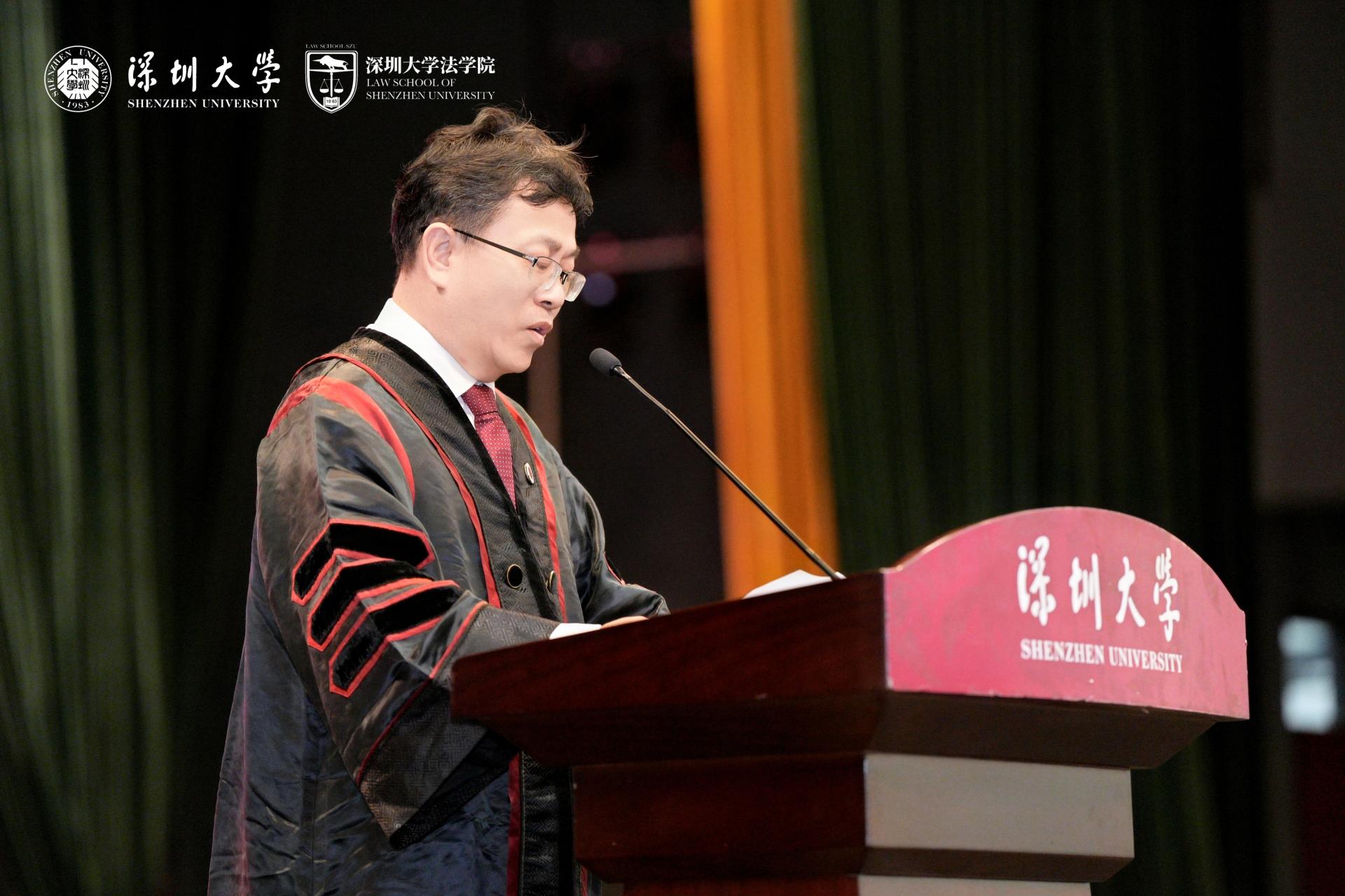 院长熊伟代表学院向全体毕业生致辞。熊院长以《脚踏实地,筑梦山海》为题,借“与时代同频的学院印记”为主线,回溯深圳大学法学院在“十四五”期间的发展历程。他强调,法学院学子用勤工俭学的严谨、志愿服务的热忱、申博攻坚的坚守、竞赛论文的锋芒,共同叠起迈向“世界一流高水平法学院”的台阶。他勉励2025届毕业生以五重维度锚定未来航向——以“安顿”为基,让历练成为成长的底气;以“跨界”为翼,让法律思维穿透社会肌理;以“全球”为境,让中国法治声音响彻国际舞台;以“建设性”为刃,在复杂现实中守护法治初心;以“小事”为阶,在知行合一中修炼大格局。最后,熊院长寄望未来,邀大家与学院共赴“十五五”之约。他祝愿大家带着深大法律人的底气与锐气,保持清醒,坚守良知,把“公平正义”的种子播撒在每一个工作岗位。