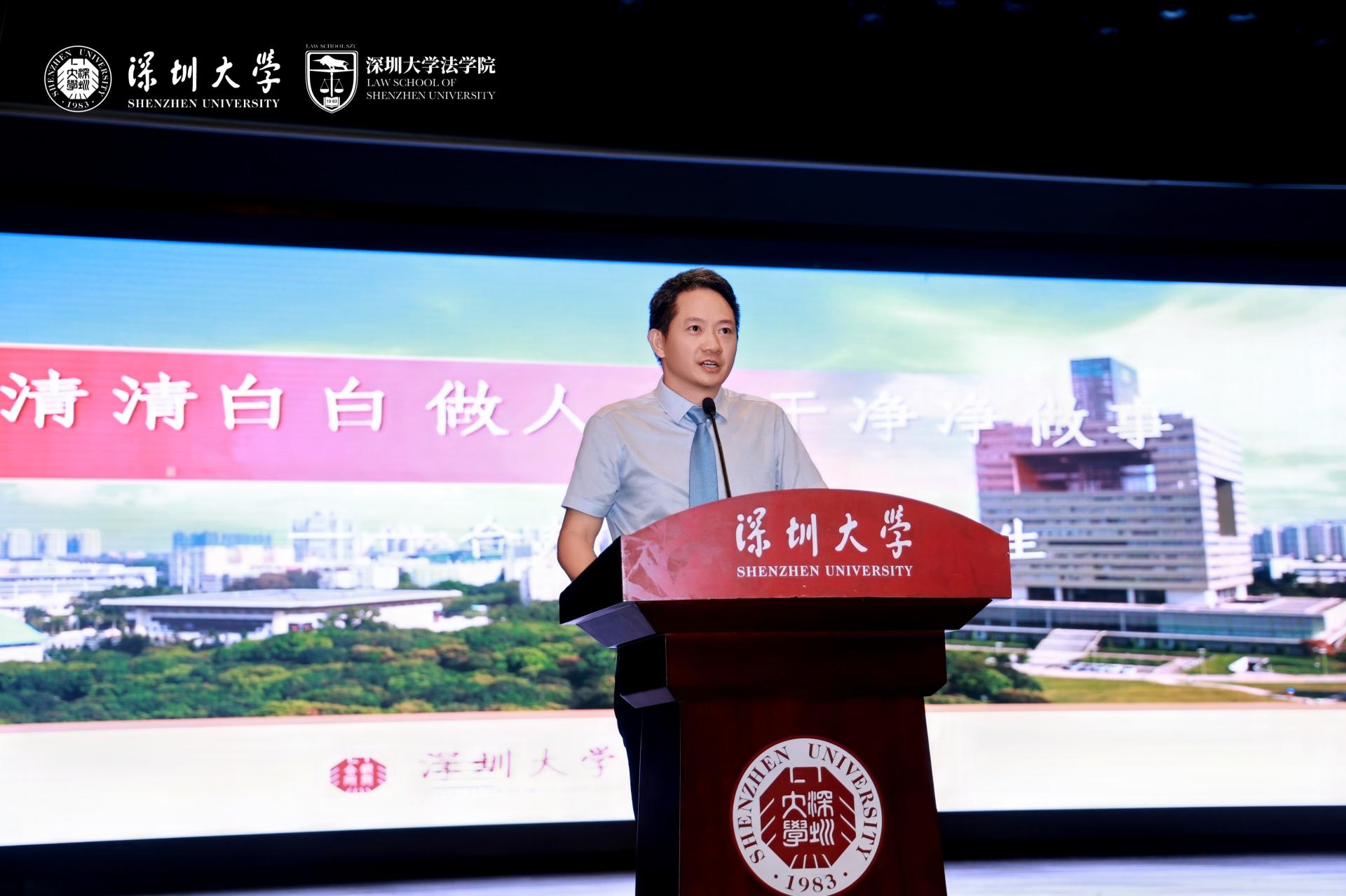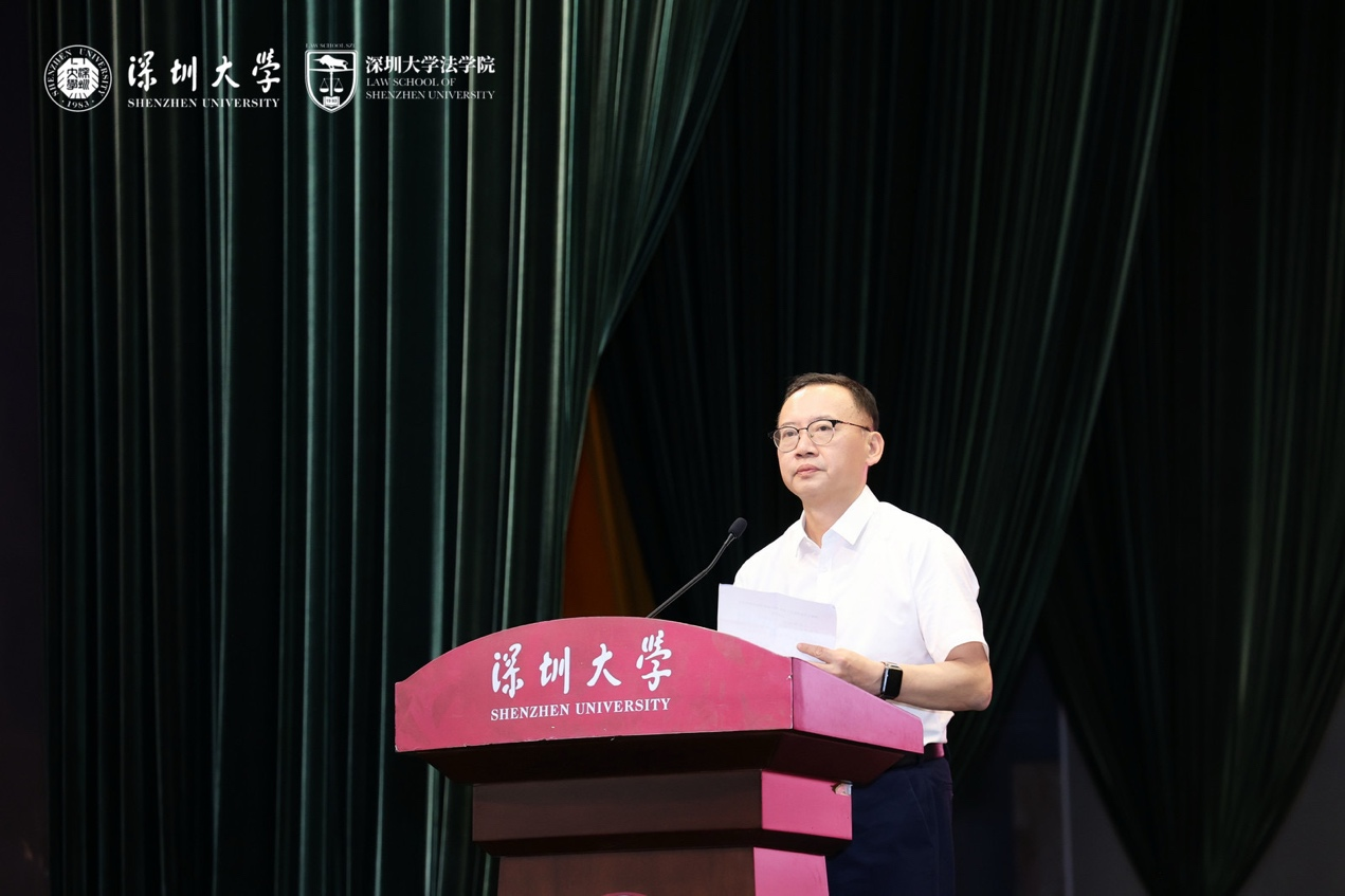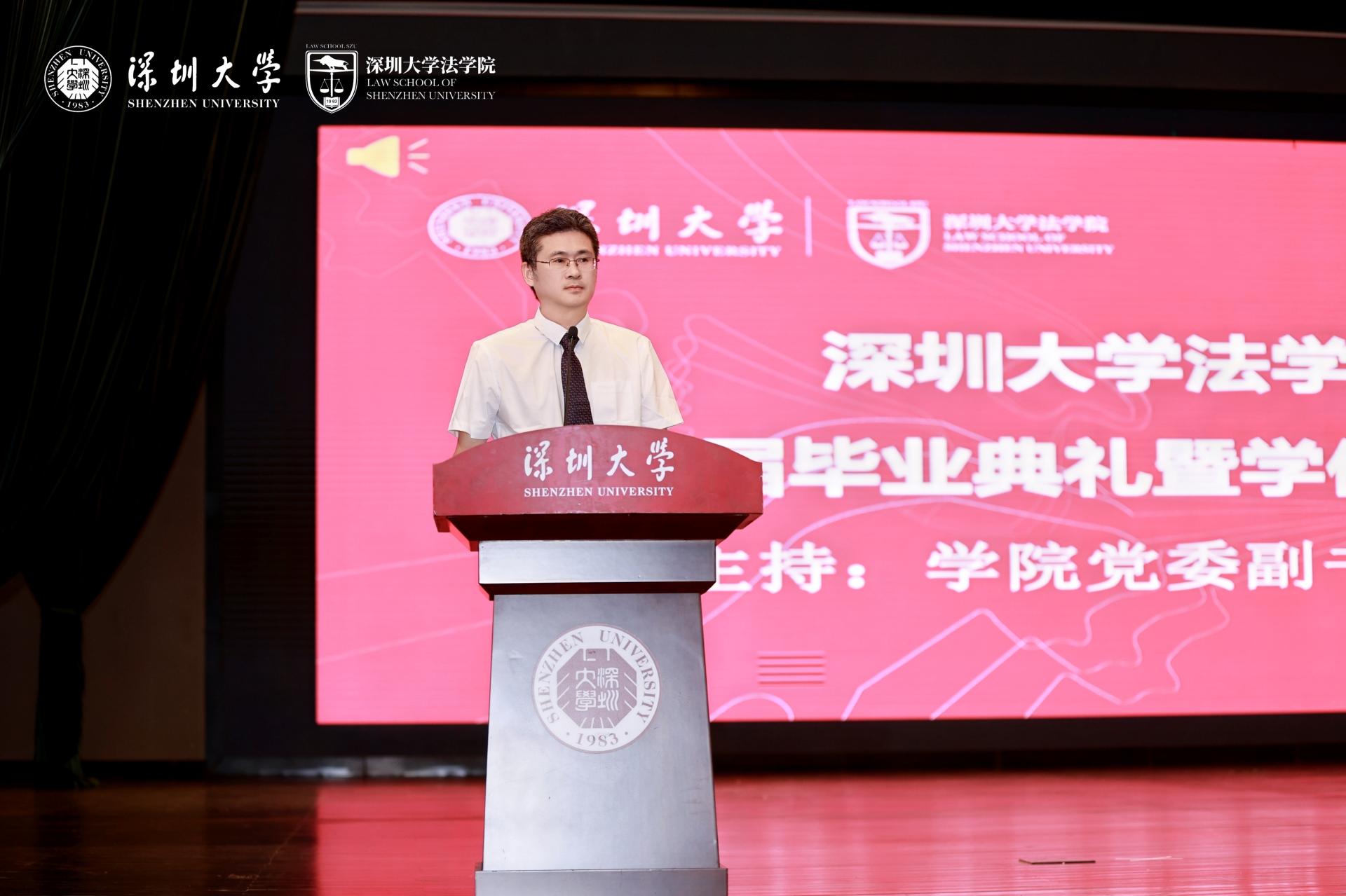 院长熊伟代表学院向全体毕业生致辞。熊院长以《脚踏实地,筑梦山海》为题,借“与时代同频的学院印记”为主线,回溯深圳大学法学院在“十四五”期间的发展历程。他强调,法学院学子用勤工俭学的严谨、志愿服务的热忱、申博攻坚的坚守、竞赛论文的锋芒,共同叠起迈向“世界一流高水平法学院”的台阶。他勉励2025届毕业生以五重维度锚定未来航向——以“安顿”为基,让历练成为成长的底气;以“跨界”为翼,让法律思维穿透社会肌理;以“全球”为境,让中国法治声音响彻国际舞台;以“建设性”为刃,在复杂现实中守护法治初心;以“小事”为阶,在知行合一中修炼大格局。最后,熊院长寄望未来,邀大家与学院共赴“十五五”之约。他祝愿大家带着深大法律人的底气与锐气,保持清醒,坚守良知,把“公平正义”的种子播撒在每一个工作岗位。