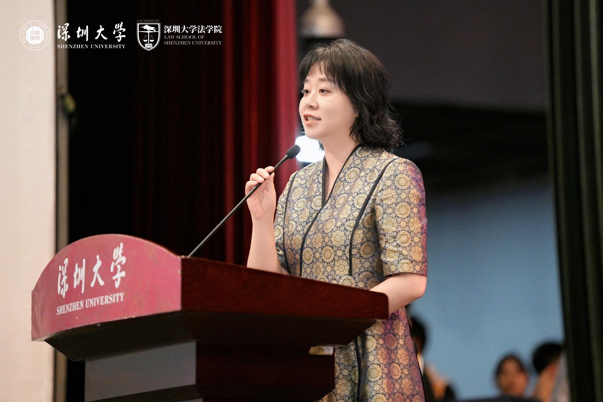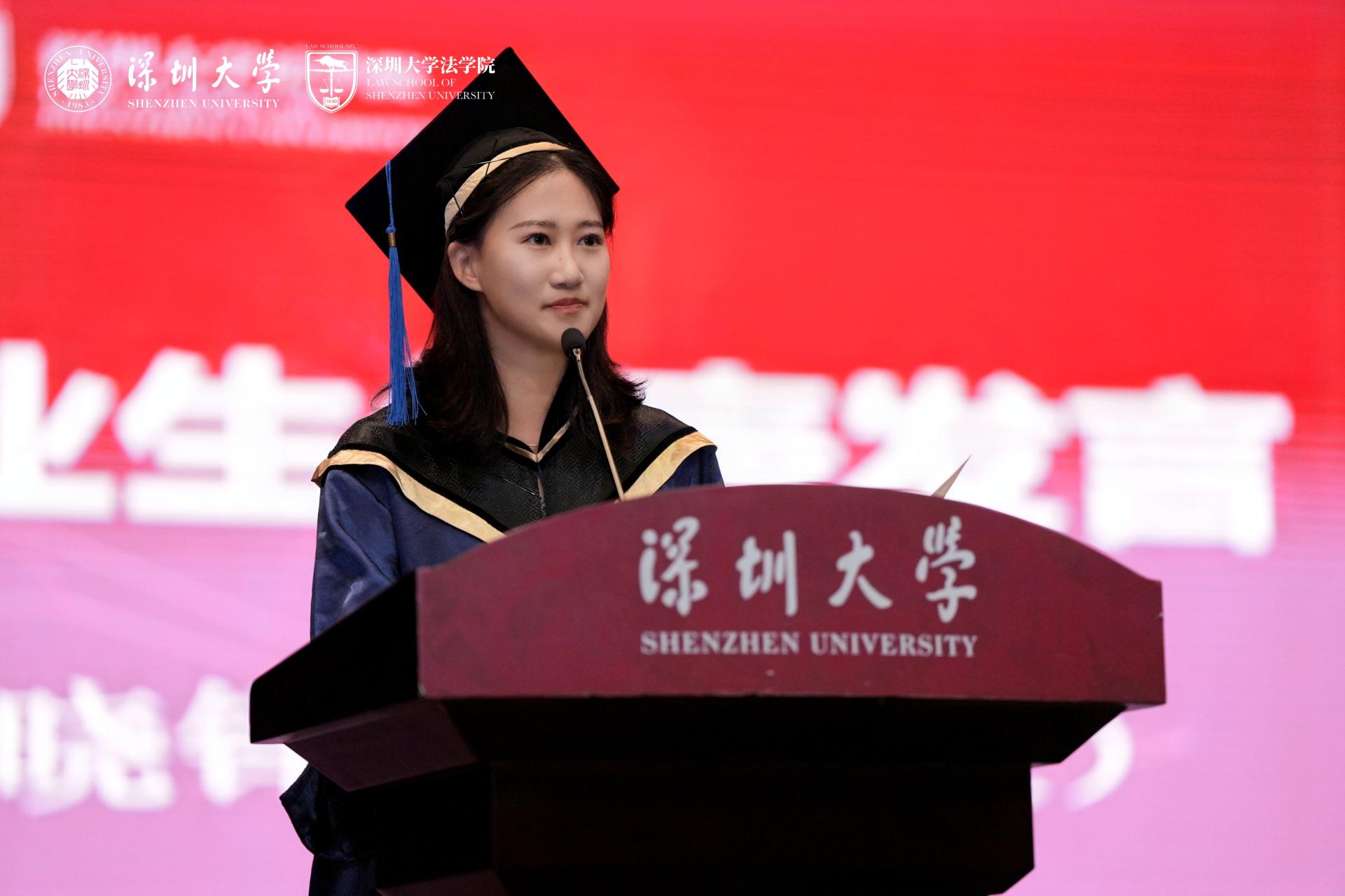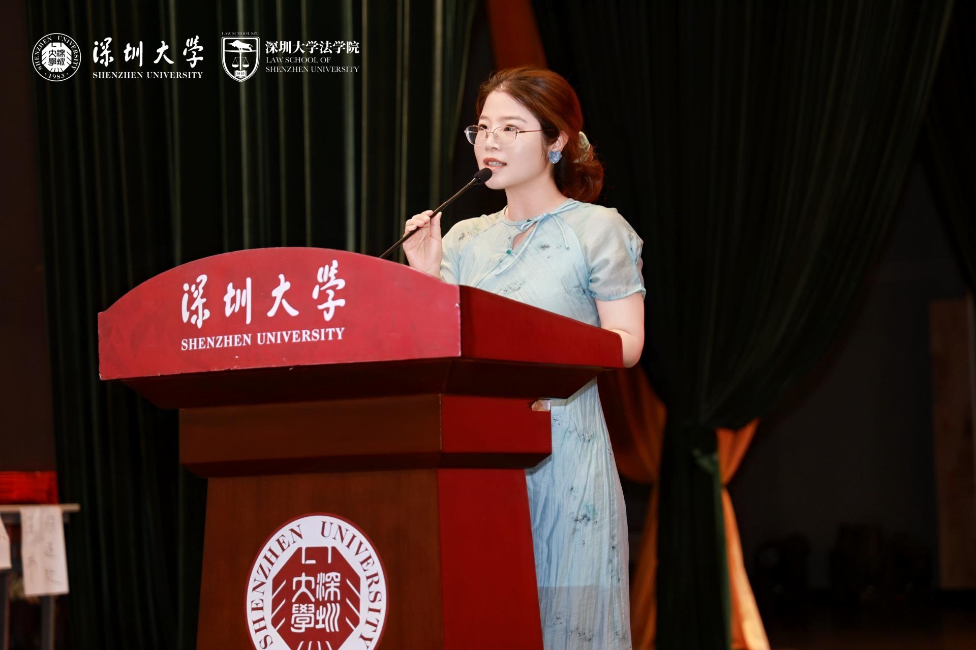 法学院校友会轮值会长黄丹娜致辞。她回忆了在深圳大学法学院的学习时光,并给毕业生们提出建议,面对世界百年未有之大变局,法学生们应当学会不断调整自己的节奏,积极寻找适合自己的未来发展方向,既要警惕眼高手低的认知陷阱,还要避免深陷躺平的泥潭,建立短、中、长期的目标,在务实中保持进取的锐气。