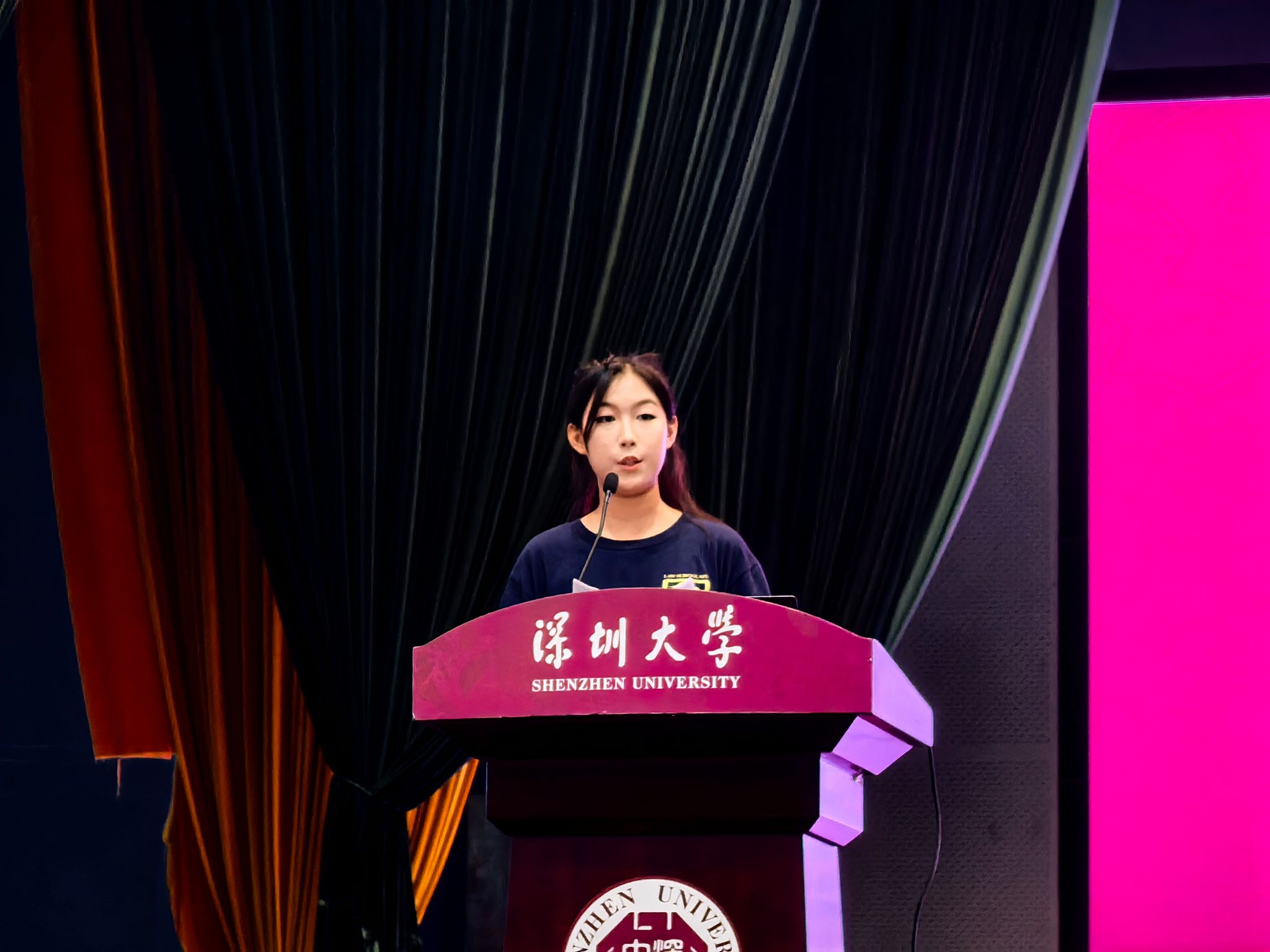2025级本科新生代表纪佳彤发言。她分享了选择深大法学的初心,并结合新的时代发展要求提出了对大学期间的学习、生活等不同方面的展望。她表示,我们有幸能在深大法学院学习,既充满机遇也富有挑战。作为新时代的法科学子,我们不仅要精研法律专业知识,更要培养高尚的道德情操,努力成为脚踏实地、明法笃行、旁求博考的合格法律人。
