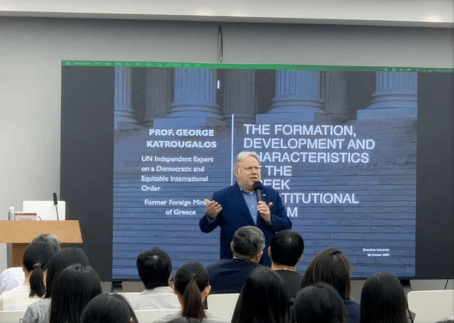2025年10月26日晚,深圳大学法学院“丽湖法治大讲坛”总第一百四十五期暨“涉外法治人才培养高端论坛”第二十期学术讲座在丽湖校区守正楼A213举办。本次讲座特邀希腊前外交部长、联合国促进民主和公平的国际秩序独立专家、国际宪法学协会副主席乔治·卡特鲁加洛斯(Georgios Katrougalos)教授,以“希腊宪法制度的形成、发展和特征”为题,为学院师生带来一场兼具历史纵深与比较法视野的学术盛宴。本次讲座由深圳大学法学院院长熊伟主持,中国社会科学院学部委员、法学研究所所长,中国法学会副会长莫纪宏与谈,中国社会科学院法学研究所博士宋家乐、深圳大学法学院副院长叶海波等众多师生到场聆听,现场气氛热烈。