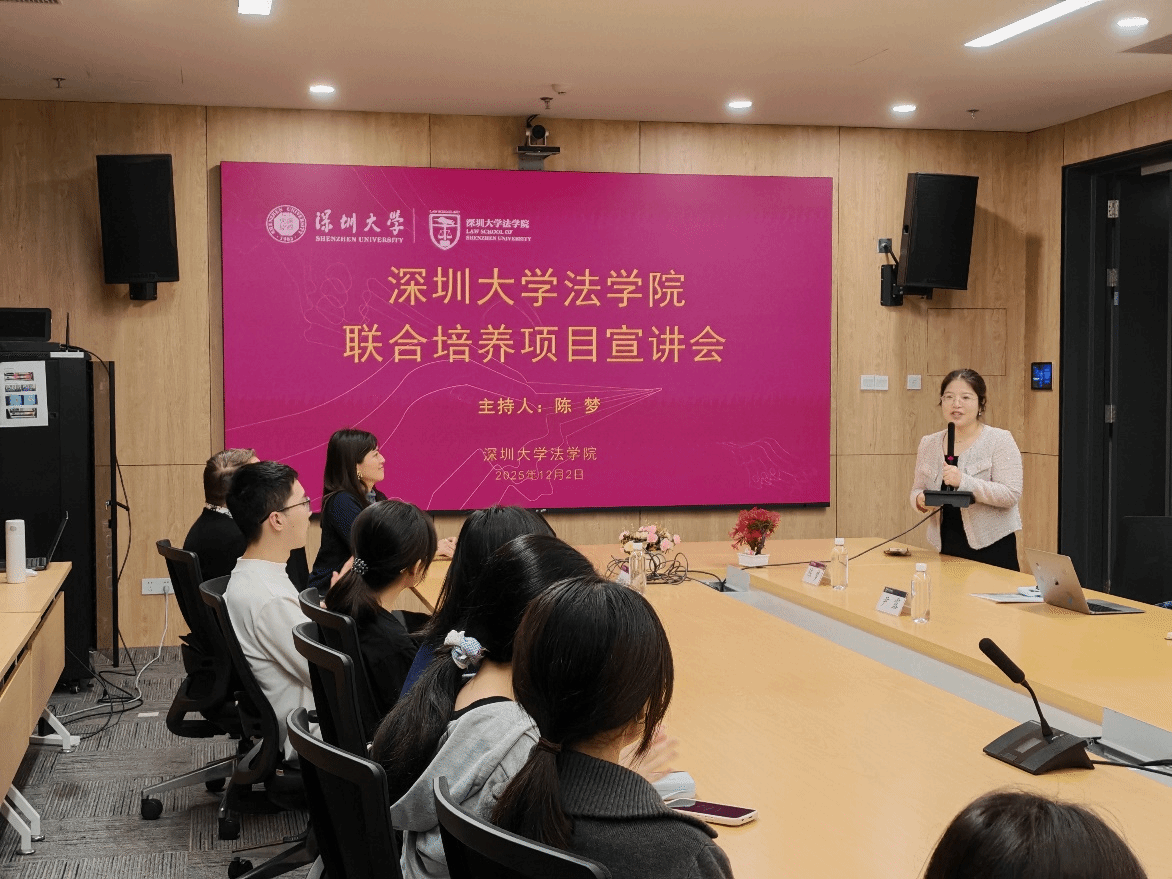 为进一步拓宽法学院学生的国际化视野,提升涉外法治人才培养质量,帮助学生全面了解学院与境内、外高校联合培养项目政策,12月2日晚,深圳大学法学院在丽湖校区明律楼418会议室举办法学院联合培养项目(境内境外)集中推介会。