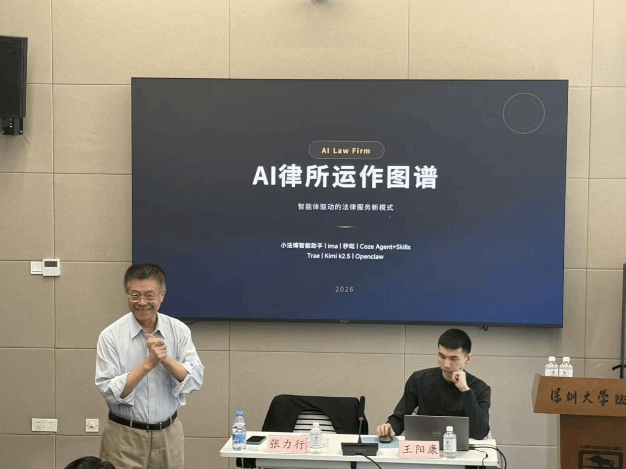 2026年3月12日,由深圳大学法学院主办、深圳大学法律与科技研究院承办的“丽湖法治大讲坛”总第一百五十七期暨“法律与科技论坛”第九期学术讲座于深圳大学丽湖校区明律楼103顺利举行。本次讲座特邀法律实验室创始人、深圳国际仲裁院首席技术顾问张力行与掌舵者AI实验室创始人王阳康,以“法律AI实战与‘龙虾’法律应用”为题展开深度分享。讲座由深圳大学法学院副院长宋旭光主持,吸引了众多法学专业的本科生及研究生到场聆听。