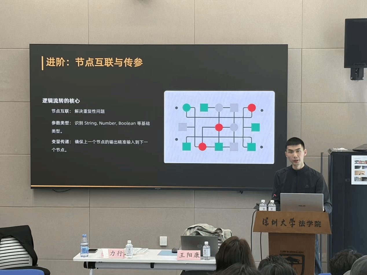 随后,讲座进入实战演示环节。张力行与王阳康逐一拆解了核心AI工具在法律场景中的应用。演示了以Coze为代表的自动化工作流搭建,如何将重复性的法律业务分解为节点,通过“节点互联与传参”,构建自动化智能助手,极大提升效率。同时,展示了如何利用“Trae”进行Vibe Coding(风格编程),打造全球访问的个人品牌主页,拥有一份令人眼前一亮的求职简历。