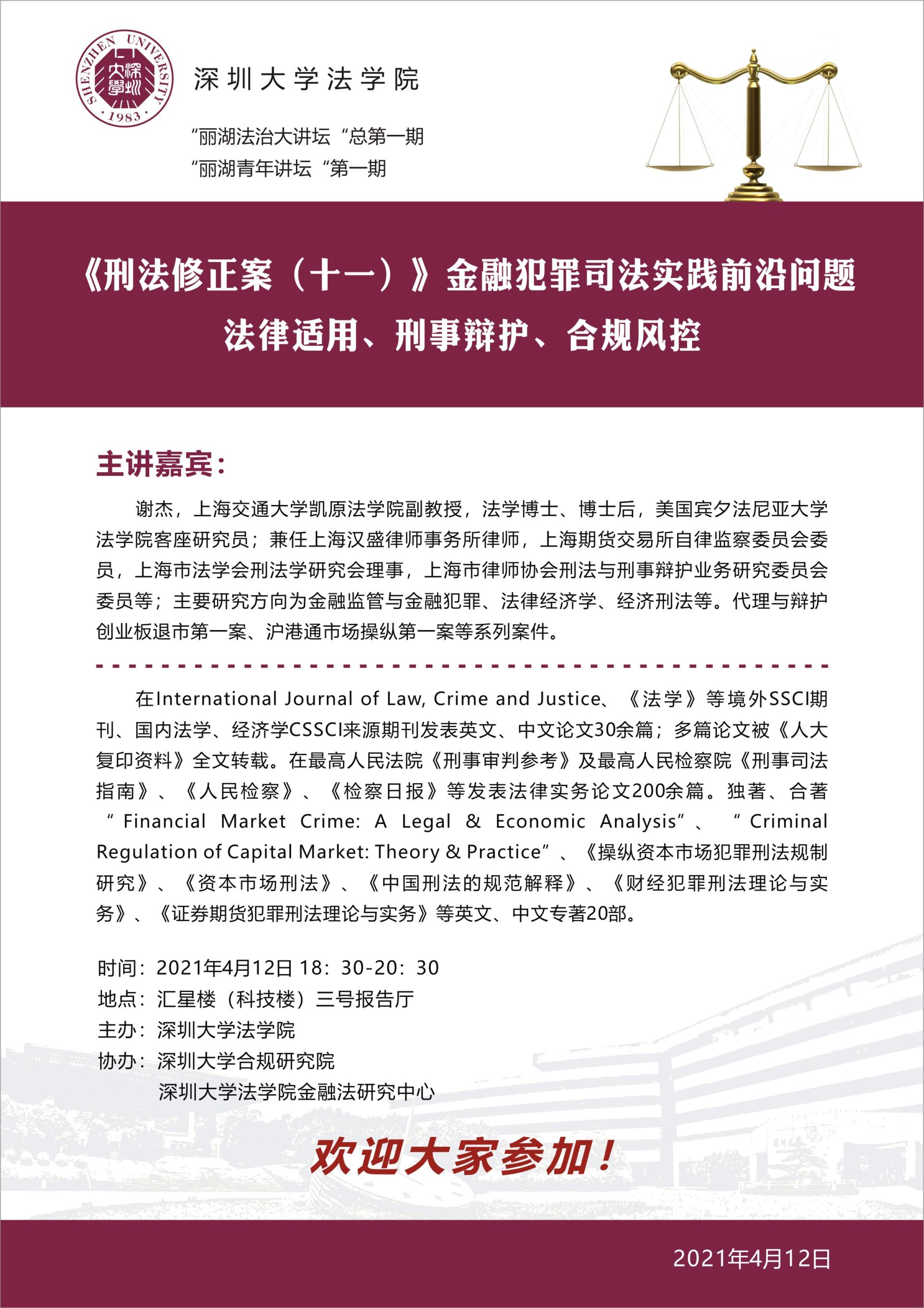 讲座主题:《刑法修正案(十一)》金融犯罪司法实践前沿问题法律适用、刑事辩护、合规风控