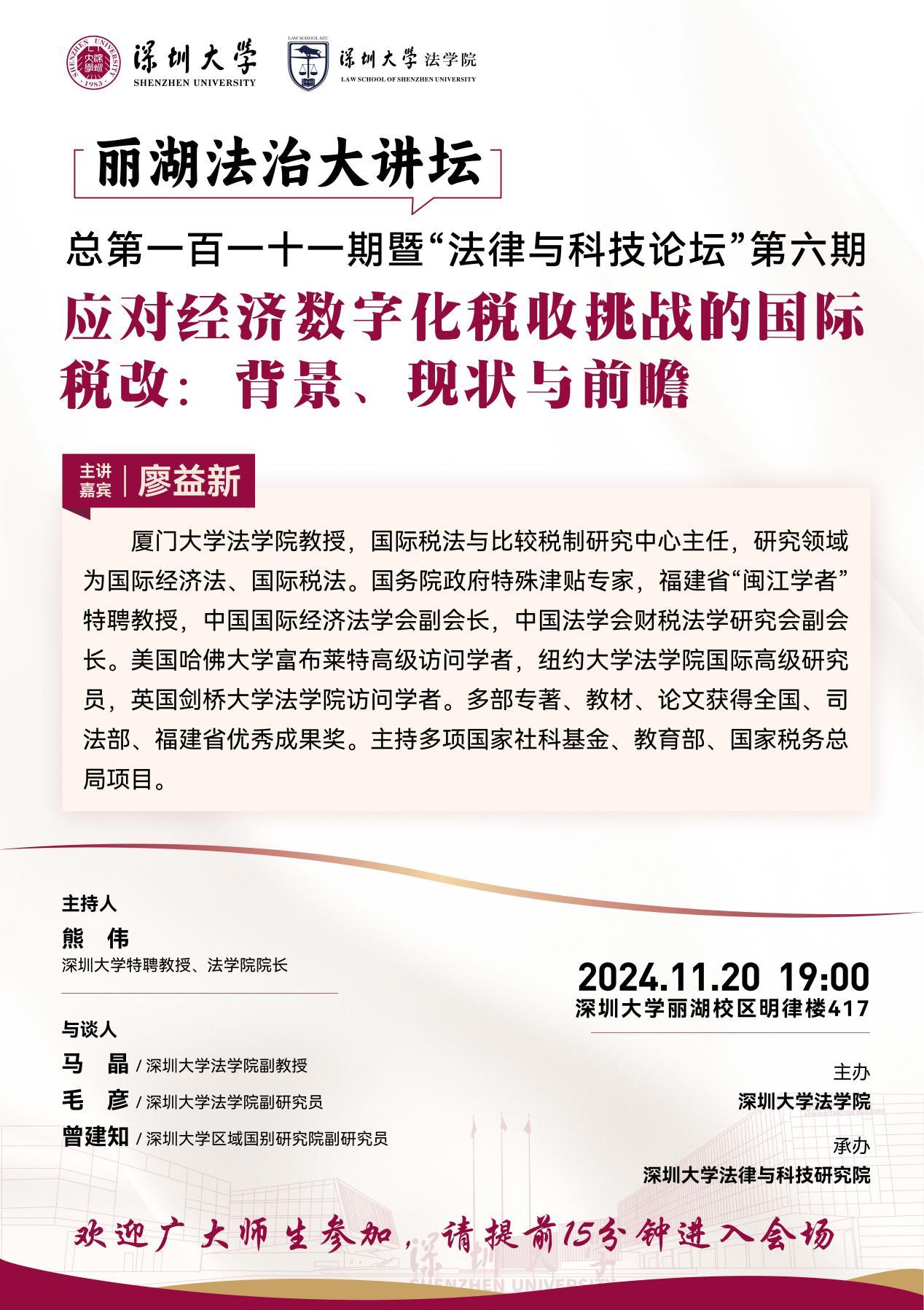 讲座预告|11月20日 廖益新:应对经济数字化稅收挑战的国际税改:背景、现状与前瞻