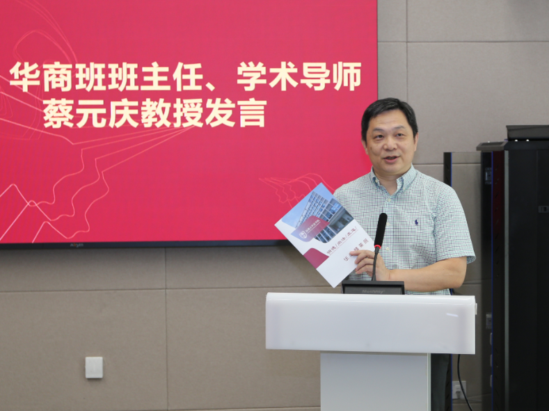 华商精英班班主任、学术导师蔡元庆教授介绍了华商精英班的教育管理理念和培养模式。他指出,华商精英班有利于弥补传统人才培养方式的劣势,在思维培养能力、案例研究能力、名校教育熏陶、法学兴趣培养等方面助力学生成才。蔡元庆教授希望将自身教学经验与有益于学生成长的理念注入到华商精英班的班主任工作当中,也希望全体同学在学习中保持兴趣,畅游法学的海洋,成为真正的“华商精英”。