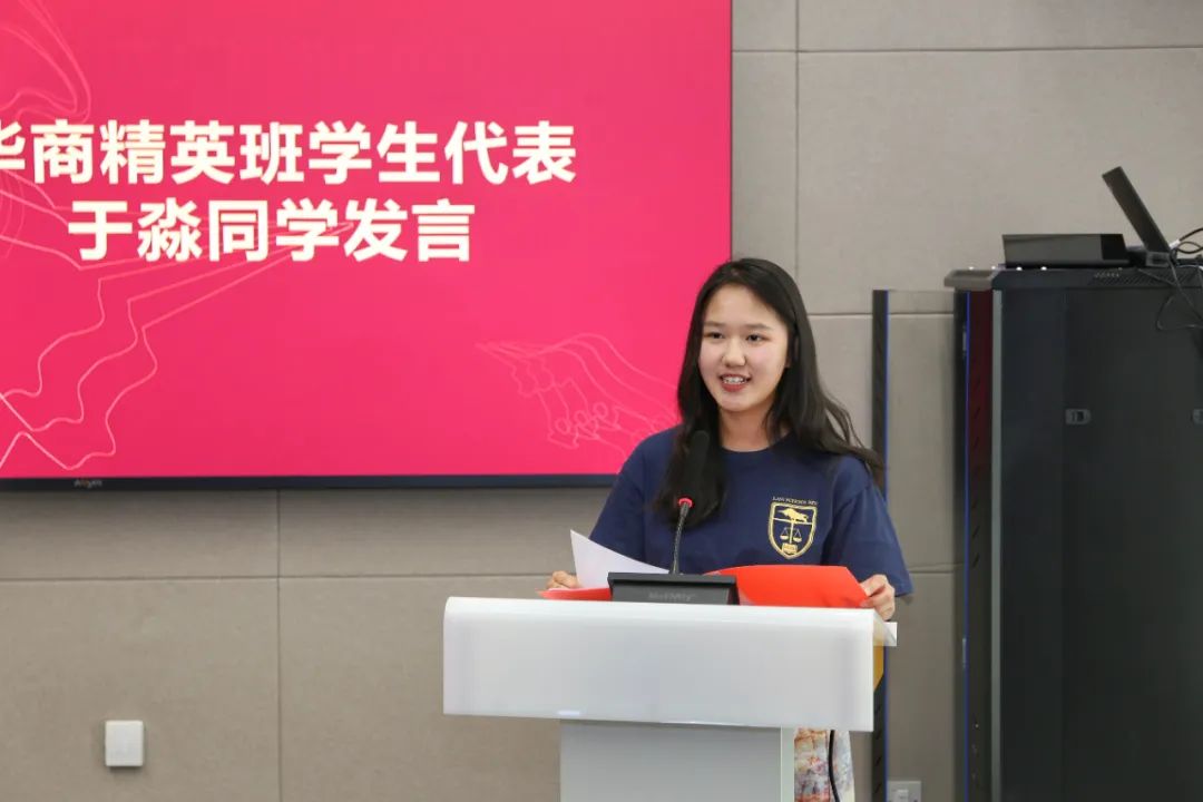华商精英班学生代表于淼同学发言,她表示有幸能够成为华商班的一员,参与到大湾区先行示范的行列中。全体华商精英班同学深知华商班开办的意义与使命,也都无比期待着未来四年中的耕耘、收获、成长与际遇。她表示,“一万年太久,只争朝夕”,我们会坚定信念,与善良为伍,与正义为伴,与德相随,不忘初心,努力成为法律之光,做真正的法律人。