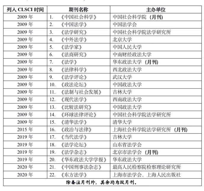 中国法学会推出的“中国法学核心科研评价来源期刊”(China Legal Science Citation Index,缩写为CLSCI)是法学学术期刊评价机制与标准较为权威的标准之一。截止2020年度,CLSCI来源期刊共计22种。