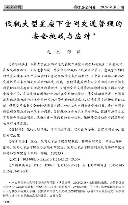 近日,我院龙杰老师等人在深圳大学权威核心期刊(2023年版)、国际政治学领域权威核心期刊《国际安全研究》(2024年第3期)发表《低轨大型星座下空间交通管理的安全挑战与应对》一文。该研究为龙杰老师与国际法研究生张韬过去一年的跨学科阶段性研究成果,本论文关注了“星链”等低轨大型星座快速发展背景下外空交通管理面临的安全挑战,并提出了国际层面的应对措施,涉及国际法学、国际政治、国家安全学、航天科学与工程等多个学科领域的研究内容,尝试提出国际空间法学的研究新范式。