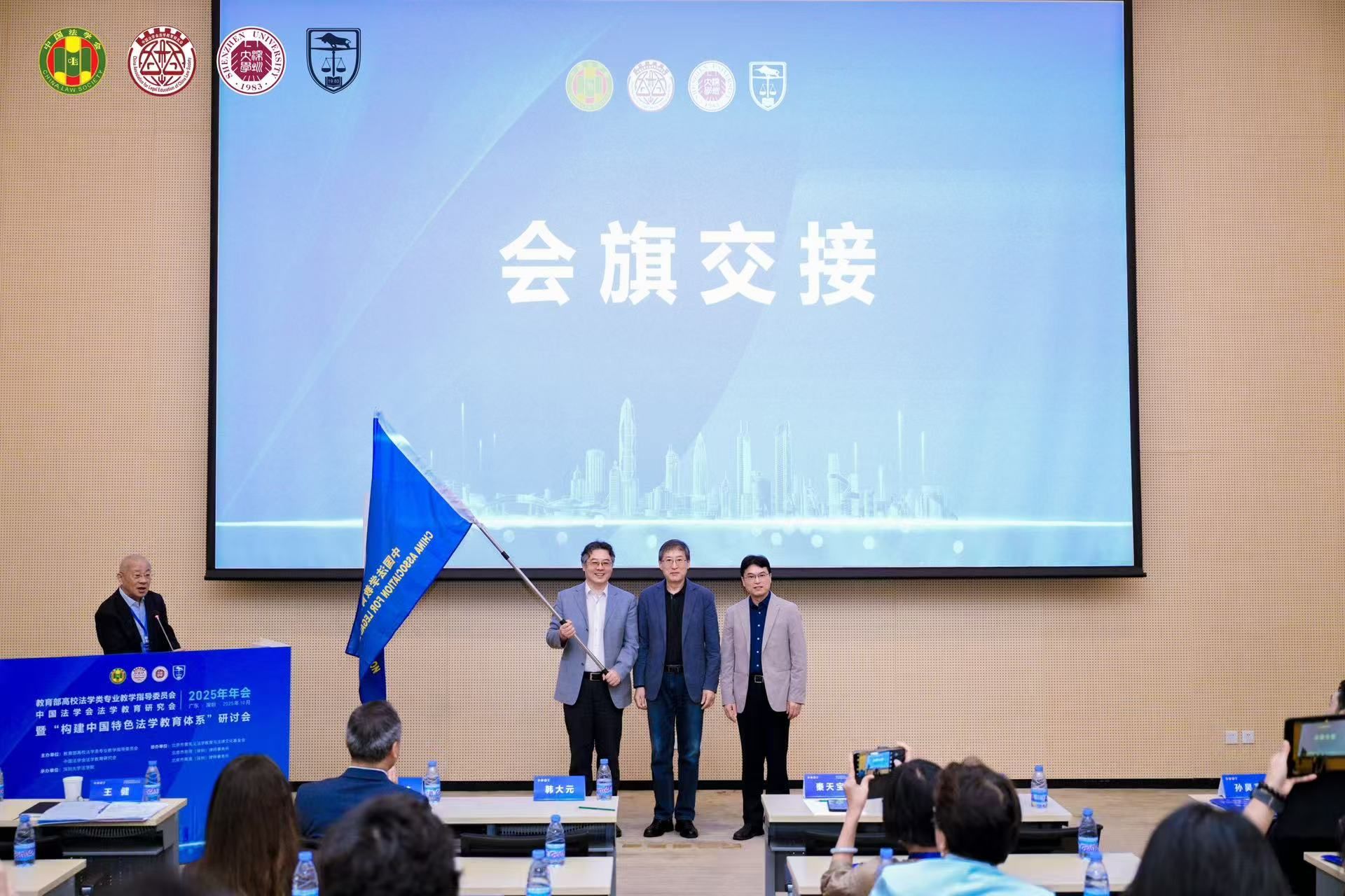 深圳大学法学院院长熊伟代表承办单位向所有工作人员及参会嘉宾表示感谢,并与下届年会承办单位武汉大学法学院院长秦天宝交接会旗。