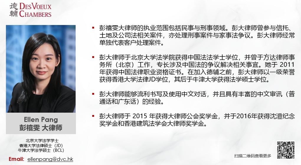 彭禧雯大律师于北京大学法学院获得中国法法学士学位,后以一级荣誉获得香港大学法律JD学位,并于牛津大学获得法学硕士学位。彭大律师的执业范围包括民事与刑事领域,曾参与信托、土地及公司法相关案件,亦处理刑事案件与家事法争议。